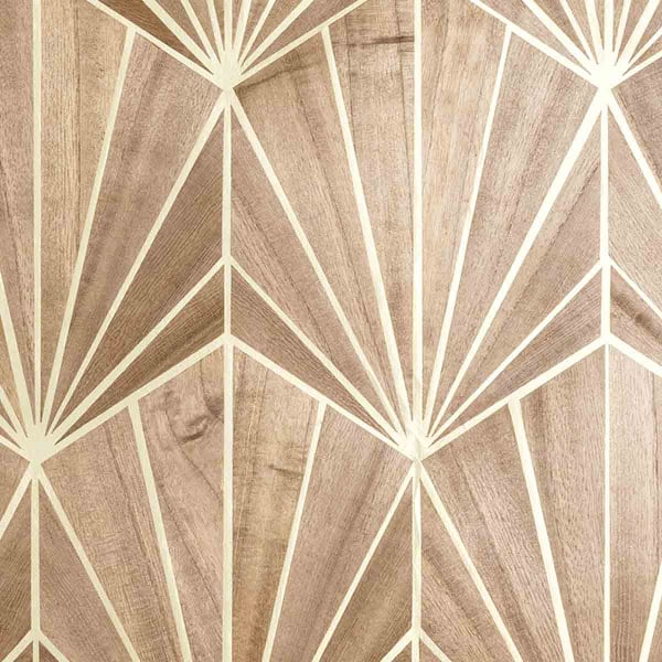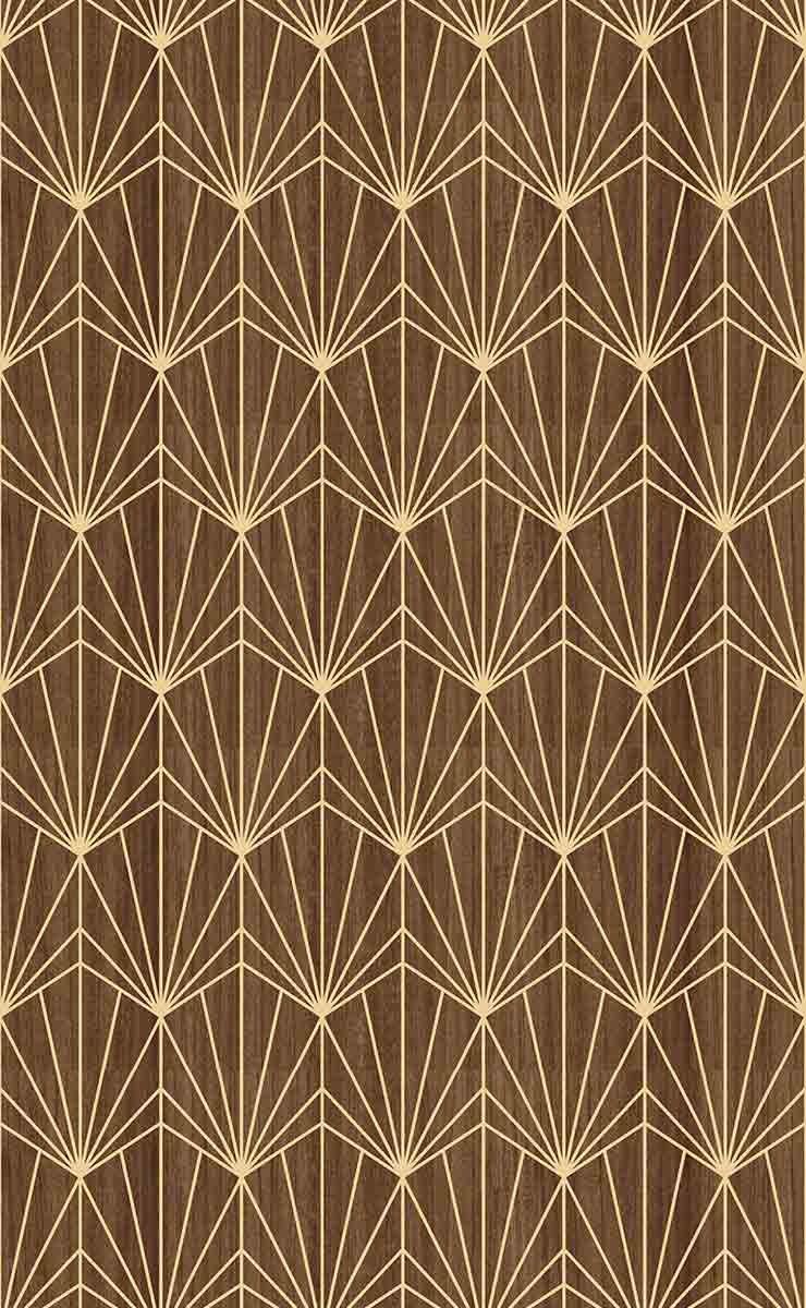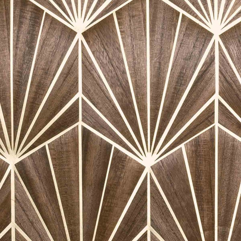 Mythique est un revêtement mural signé Casamance, dont le motif géométrique évoque l’art de la marqueterie avec une intensité graphique. Des éclats de bois, déployés en éventail, révèlent la noblesse des matières, savamment juxtaposées. L’assemblage manuel souligne la richesse naturelle de l’essence. La composition suggère un mouvement subtil, entre rigueur symétrique et vibration organique.