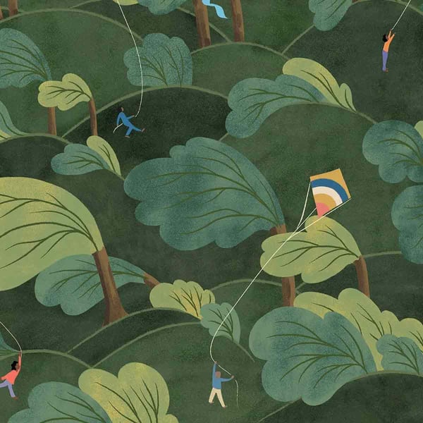A Windy Day est un Papier peint panoramique baigné par le souffle discret d’une brise sur un paysage vallonné. Le motif illustratif montre des enfants emportés dans un jeu joyeux de cerfs-volants. Le décor suggère un mouvement continu, rythmé par la cadence du vent invisible. Signé Boråstapeter, il évoque un monde léger et silencieux.