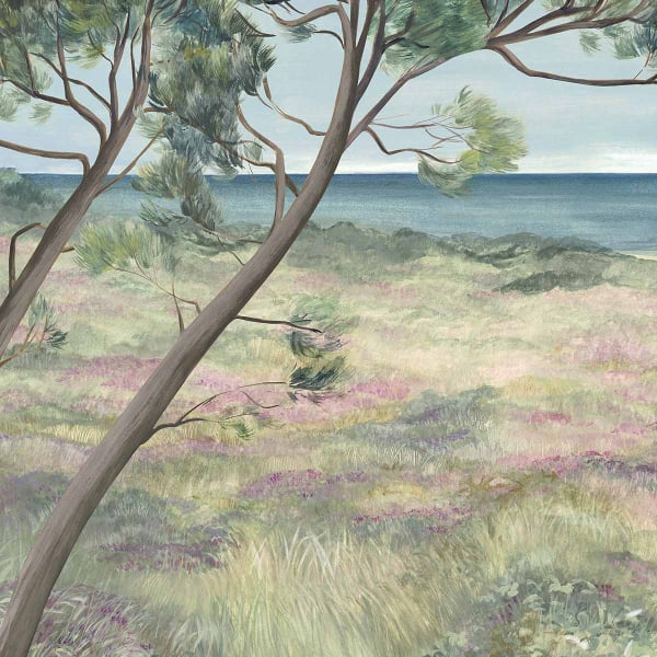 Le Sentier des Douaniers est un papier peint panoramique aux allures de tableau bucolique. Ce motif paysage, peint à la main, rend hommage aux terres bretonnes bordées par l’océan. Une lande parsemée de bruyères et d’herbes fines mène à une plage paisible, encadrée de pins maritimes. La scène, conçue par Les Dominotiers, restitue la quiétude d’un rivage entre végétation et lumière.