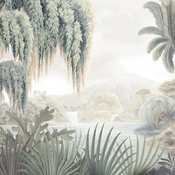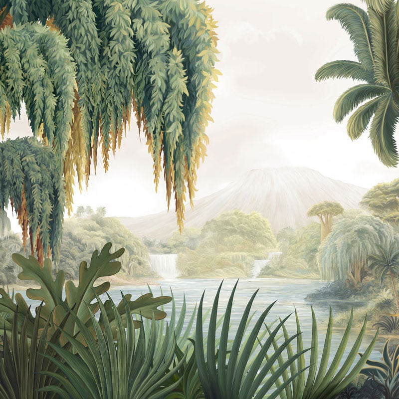 Le papier peint panoramique Les Plaines Sauvages s’ouvre sur une nature silencieuse, bercée par des cascades. Il déploie un motif de paysage tropical, peuplé d’arbres majestueux, de végétation opulente et de fleurs exotiques. La composition suit un mouvement apaisé, guidée par la souplesse des lignes et la douceur des formes. London Art révèle un monde suspendu, entre rêve et luxuriance.