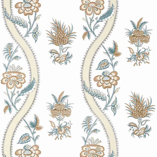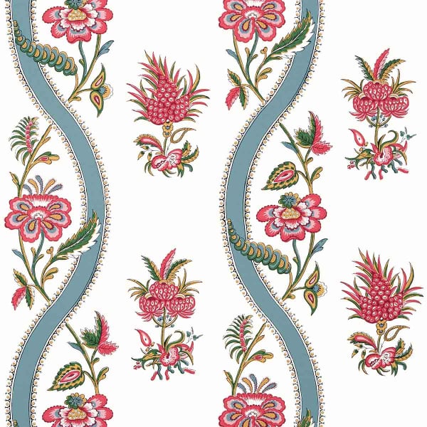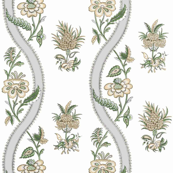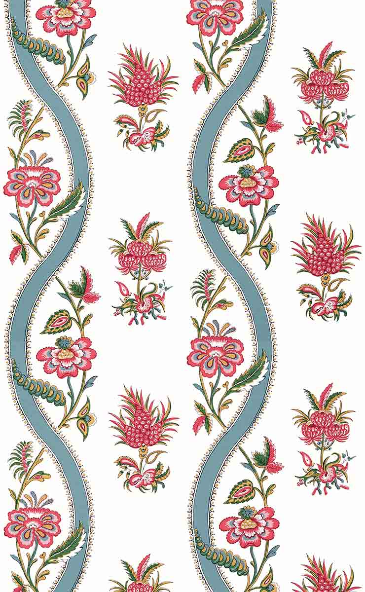 Sur fond clair, Floral Ribbon déploie un papier peint au motif floral stylisé inspiré des textiles anciens d’Inde. Des bouquets imaginaires alternent avec des volutes sinueuses bordées de perles, créant une rythmique fluide. Le dessin, conçu par impression, révèle des détails foisonnants et une composition équilibrée. L’éditeur Thibaut perpétue ici un savoir-faire raffiné sur intissé.