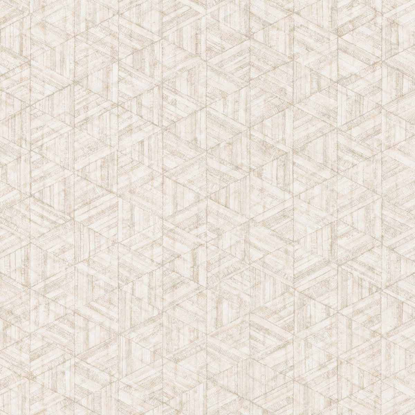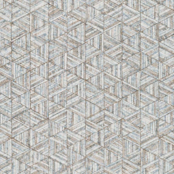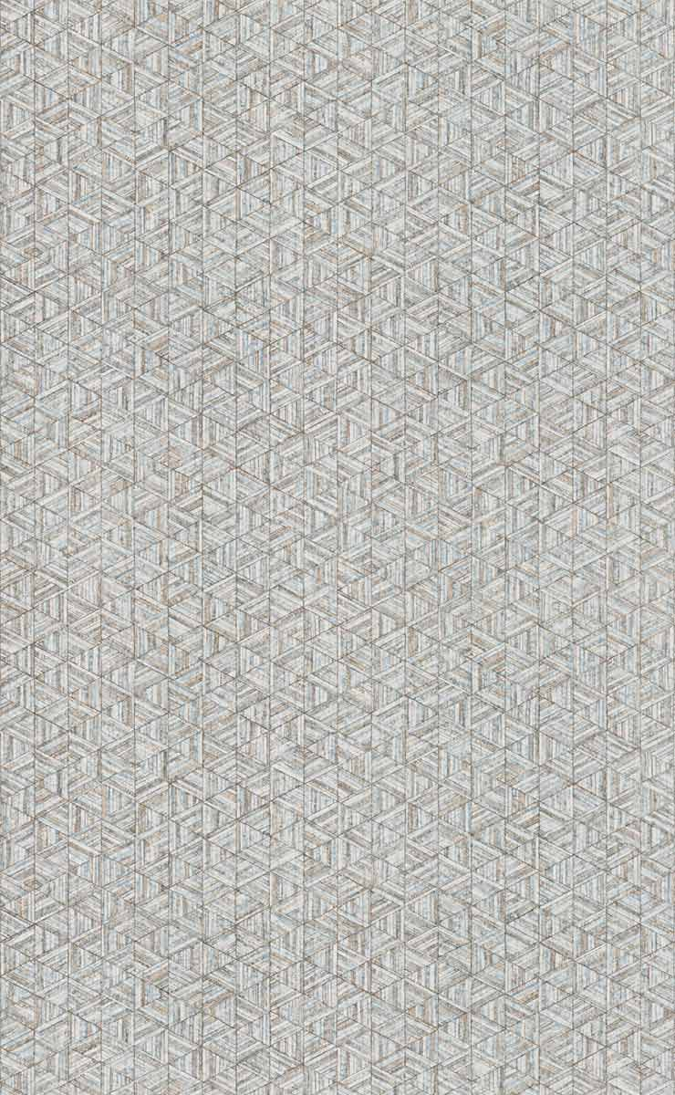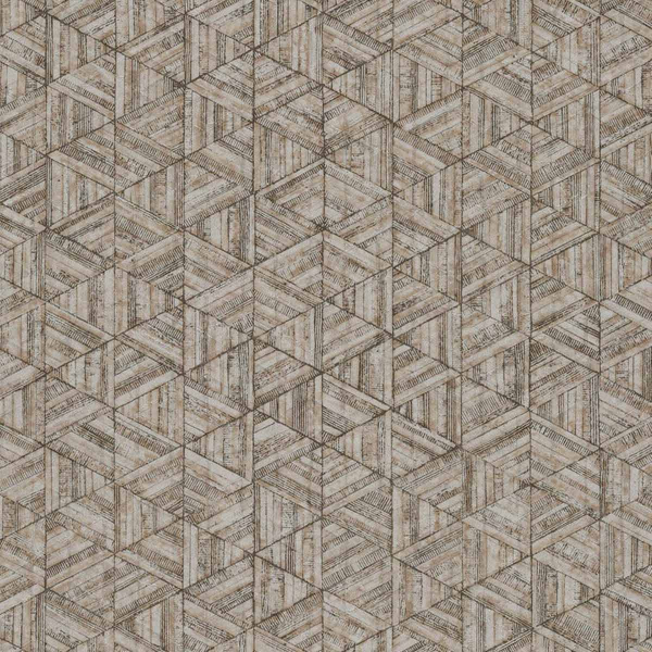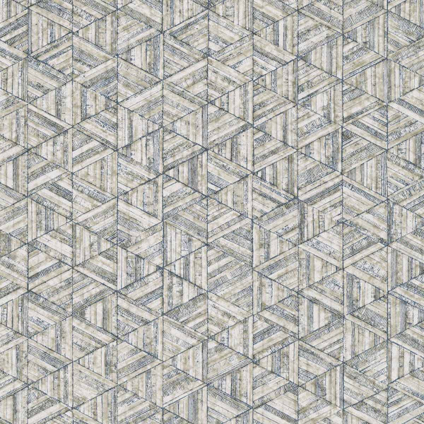 Rune est un papier peint au motif géométrique, dessiné à la main, qui évoque la structure d’un treillage d’hexagones texturés. Chaque forme semble taillée dans une matière ancienne, marquée de fines stries, comme une surface patinée par le temps. L'effet d’illusion visuelle naît d’un jeu d’angles et de reliefs savamment orchestré. L’ensemble, signé York Wallcoverings, révèle une rigueur graphique adoucie par la densité du trait.