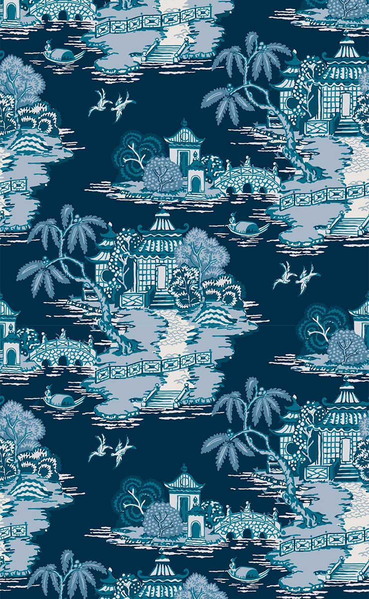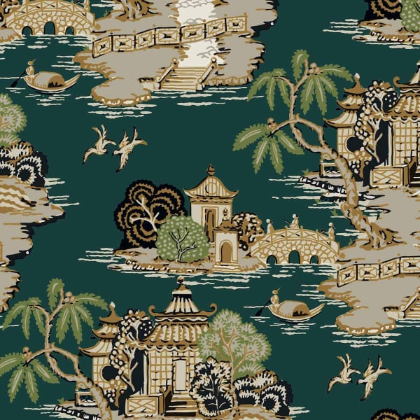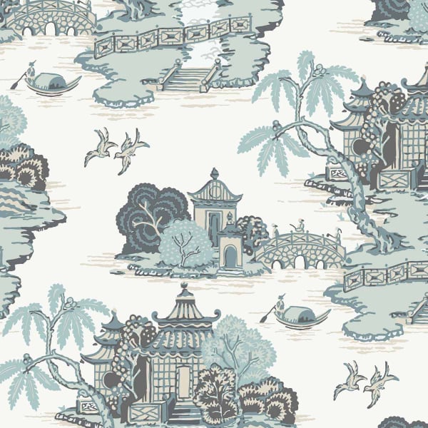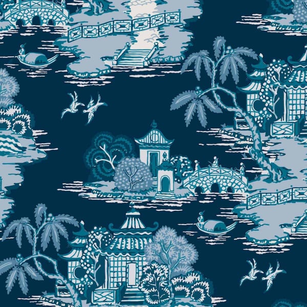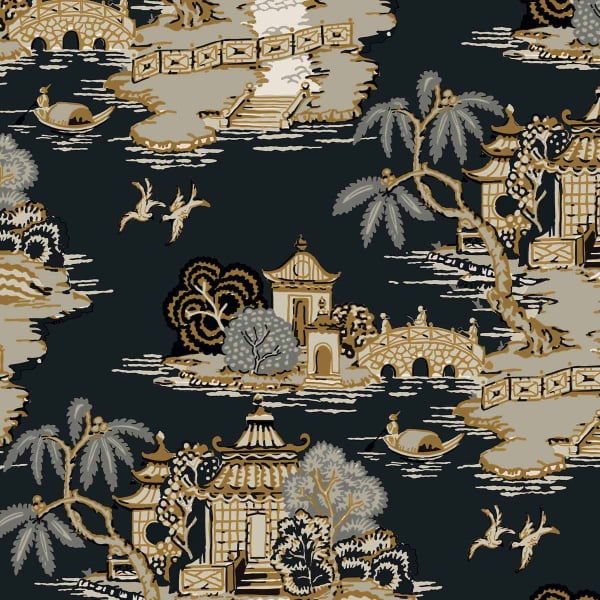 Le Pagoda and Sampan est un papier peint qui dévoile un motif toile de Jouy asiatique dans une composition foisonnante et évocatrice. Pavillons anciens, passerelles finement sculptées, arbres luxuriants et scènes de navigation évoquent un paysage calme et serein. Le dessin, réalisé par impression, révèle des lignes souples, des textures subtiles et une finesse qui rappelle le geste de l’artisan. York Wallcoverings perpétue ici un savoir-faire délicat, où chaque scène s’inscrit dans une esthétique intemporelle.