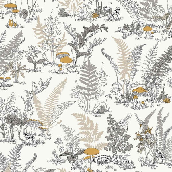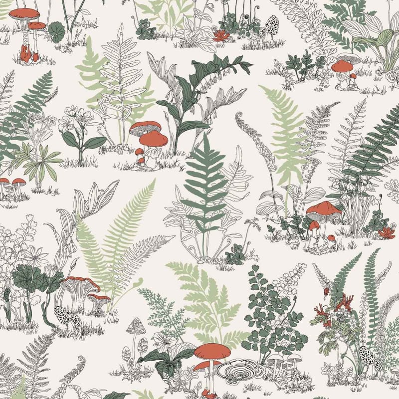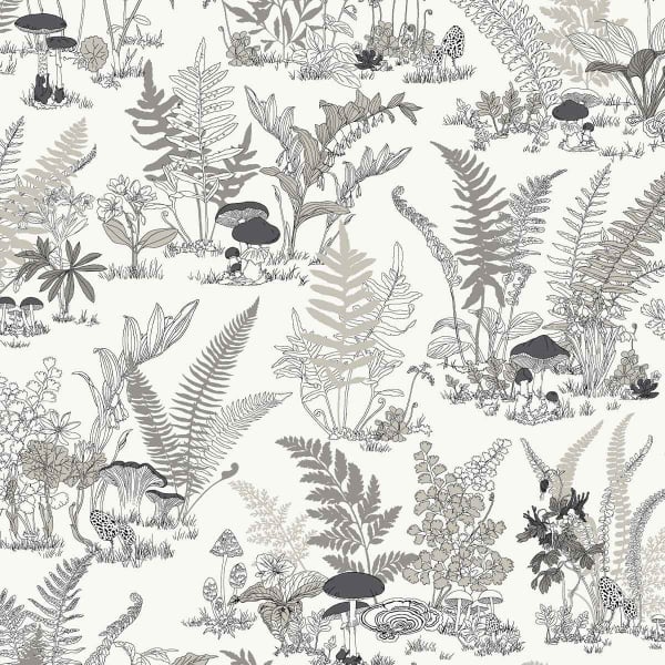 Mushroom Garden Toil est un papier peint édité par York Wallcoverings. Son motif déploie une scène botanique foisonnante, inspirée d’un sous-bois naturel. Des fougères, fleurs sauvages, champignons et plantes exotiques s’entrelacent dans un tracé fin, proche des planches naturalistes anciennes. La composition, dense, mais aérée, instaure un équilibre régulier entre les formes.