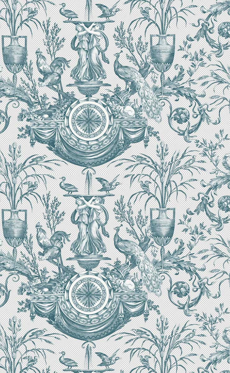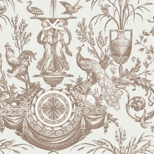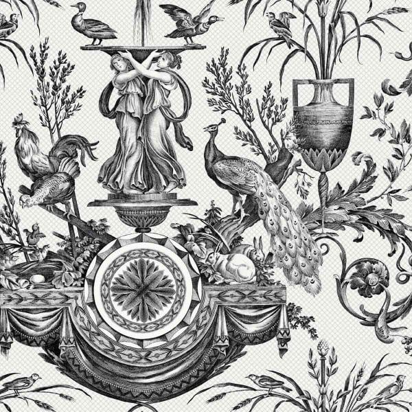 Le papier peint Avian Fountain Toile présente un motif toile de Jouy d'une grande richesse graphique. Des paons majestueux, des vases antiques et des figures féminines s'articulent autour d'une fontaine centrale, dans un décor symétrique foisonnant de feuillages. Chaque élément est tracé avec minutie, dans le style d’une gravure à l’eau-forte. L’ensemble s’inscrit dans l’esthétique néoclassique propre aux créations York Wallcoverings.