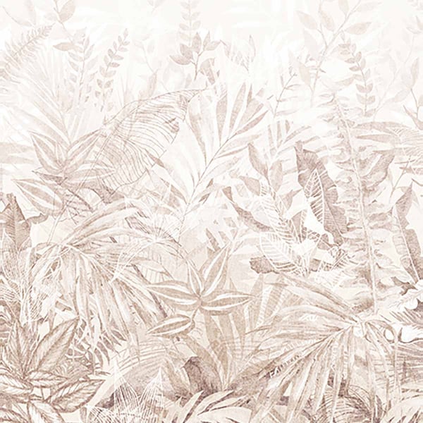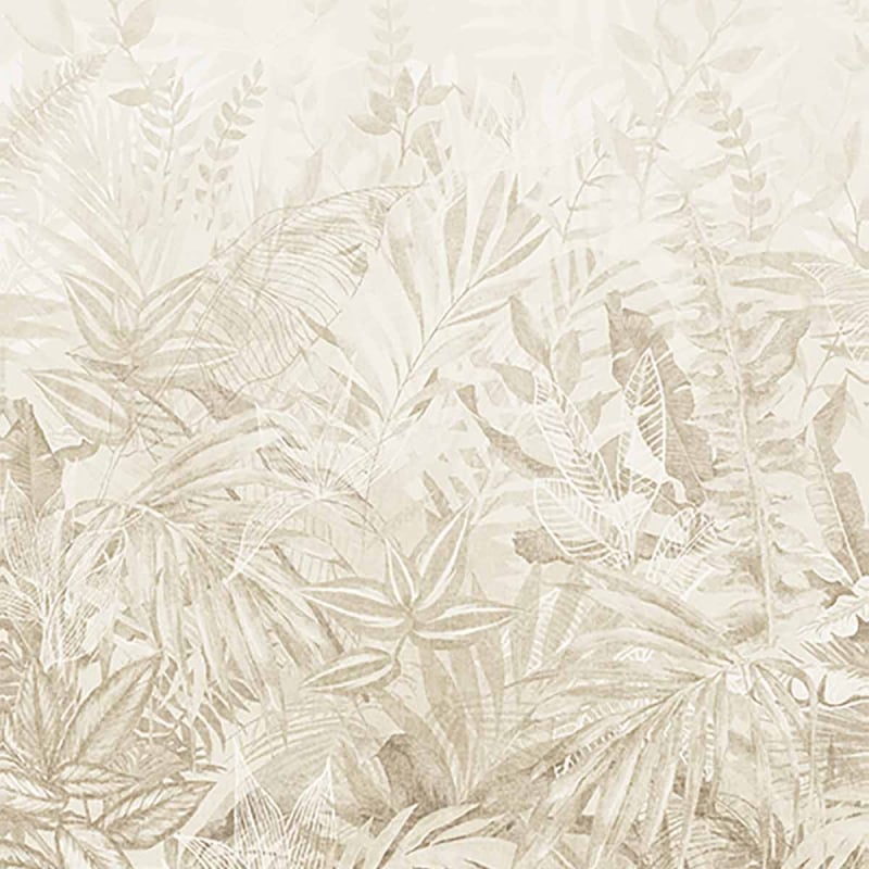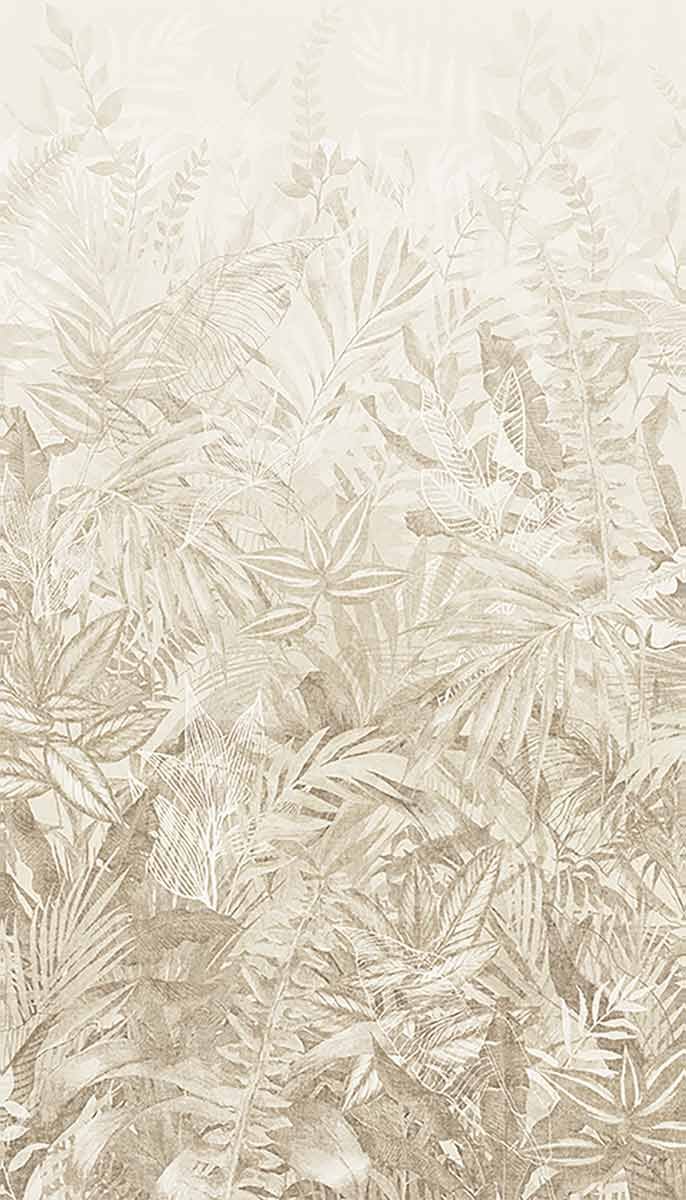 Sur le papier peint Feuillet d’Eijffinger dans la collection Rivièra Maison, la nature se révèle en transparence dans une composition foisonnante. Palmes, monstera et calathéas s’entrelacent dans un dégradé de teintes naturelles. Le motif évoque une végétation tropicale dense, alternant contours fins et aplats texturés pour créer un effet de profondeur.
