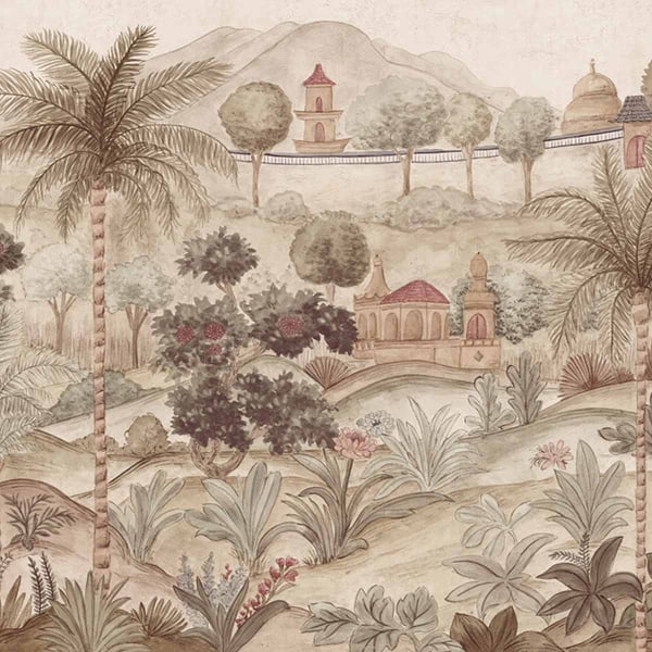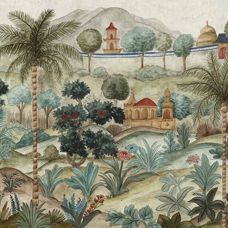 Le papier peint panoramique Forêt, signé Eijffinger, esquisse un monde imaginaire où des constructions empreintes d’exotisme côtoient une nature foisonnante. Le motif fantaisie déroule une scène dense et narrative. Au premier plan, une végétation luxuriante composée de palmiers élancés, de feuillages tropicaux et de fleurs stylisées encadre le décor. À l’arrière-plan, un paysage vallonné évoque un jardin sacré, traversé de pavillons, de pagodes et de sentiers sinueux.