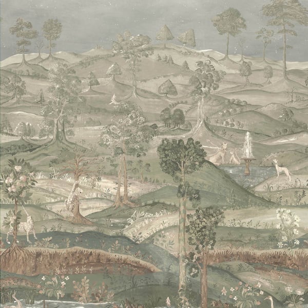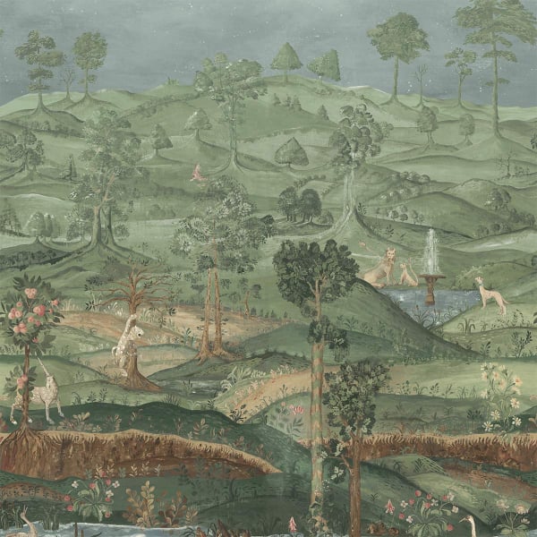 Le papier peint panoramique Royal Park déploie un motif de paysage fantastique aux allures de tapisserie ancienne. Des collines souples s’étendent à perte de vue, peuplées de cerfs, lièvres, paons et créatures oniriques. Au premier plan, une rivière serpente entre troncs d’arbres et floraisons délicates. Plus loin, des sentiers sinueux mènent à une fontaine paisible, gardée par des silhouettes animales. Ce décor foisonnant de détails évoque les fresques anciennes, recréées avec soin par GP & J Baker dans un esprit pastoral.