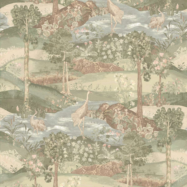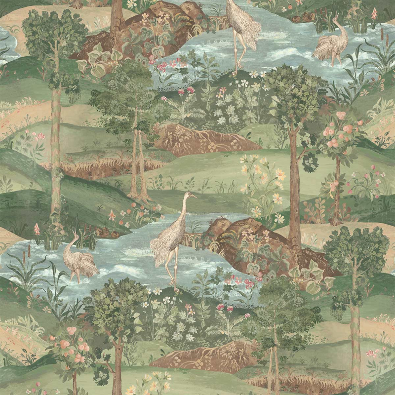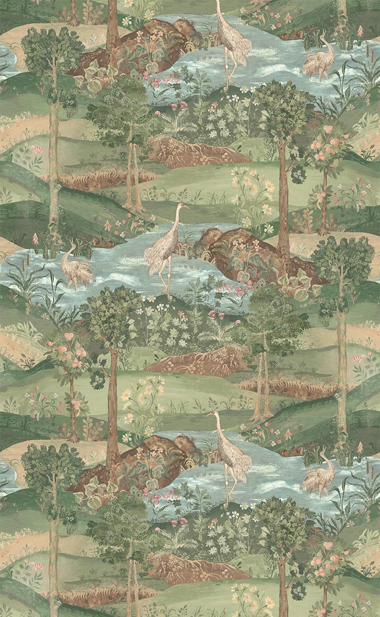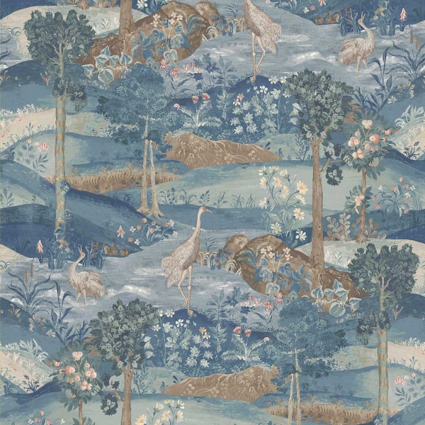 Palace Tapestry est un papier peint à motif naturaliste représentant un paysage rythmé par des rivières calmes, des collines boisées et une végétation foisonnante. Des autruches avancent paisiblement entre les arbres, dans une scène préservée et silencieuse. Le dessin soigné évoque une tapisserie ancienne, avec une attention portée à chaque feuille, chaque relief. GP & J Baker compose ici une fresque détaillée, où les éléments s’entrelacent pour former un ensemble harmonieux et vivant.