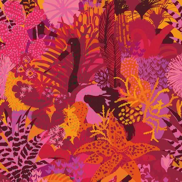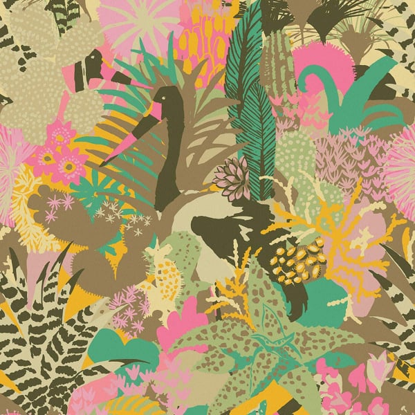 Le papier peint Giungo Bongo déploie une jungle tropicale dans un enchevêtrement de feuillages et de fleurs exubérantes. Le motif botanique s’inspire des dessins de Ken Scott, entre formes colorées et textures animales. Une grande grue élancée traverse cette nature foisonnante et imaginaire. Inkiostro Bianco imprime ce décor exotique en conservant toute l’intensité du tracé d’origine.