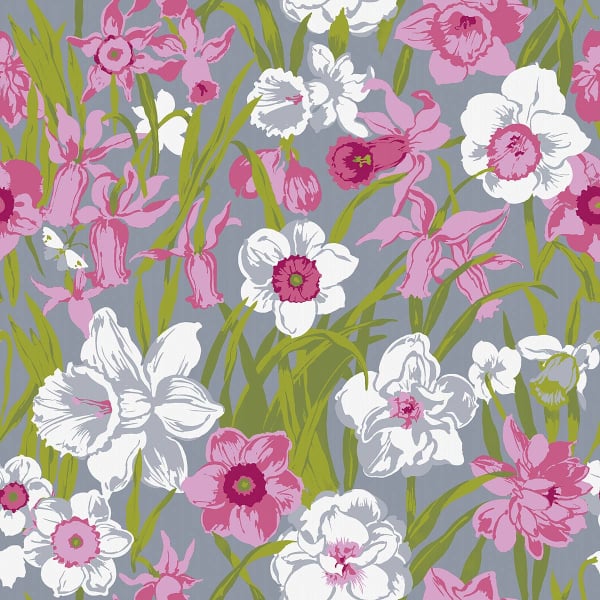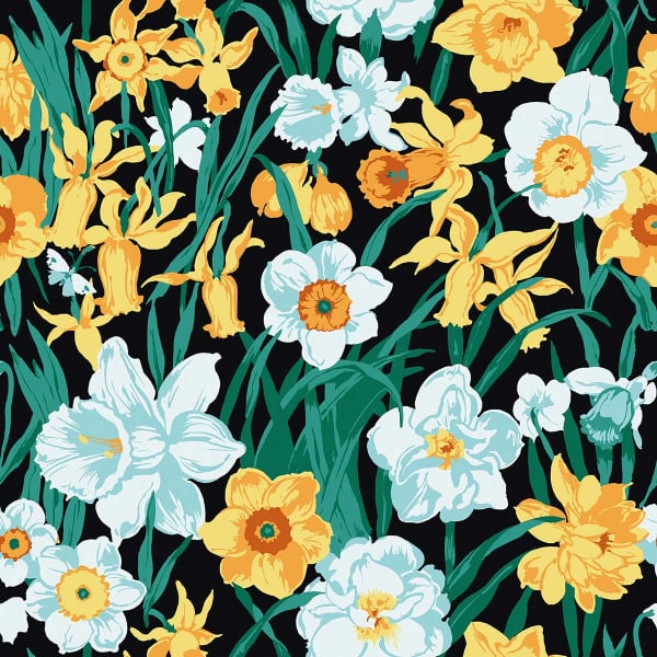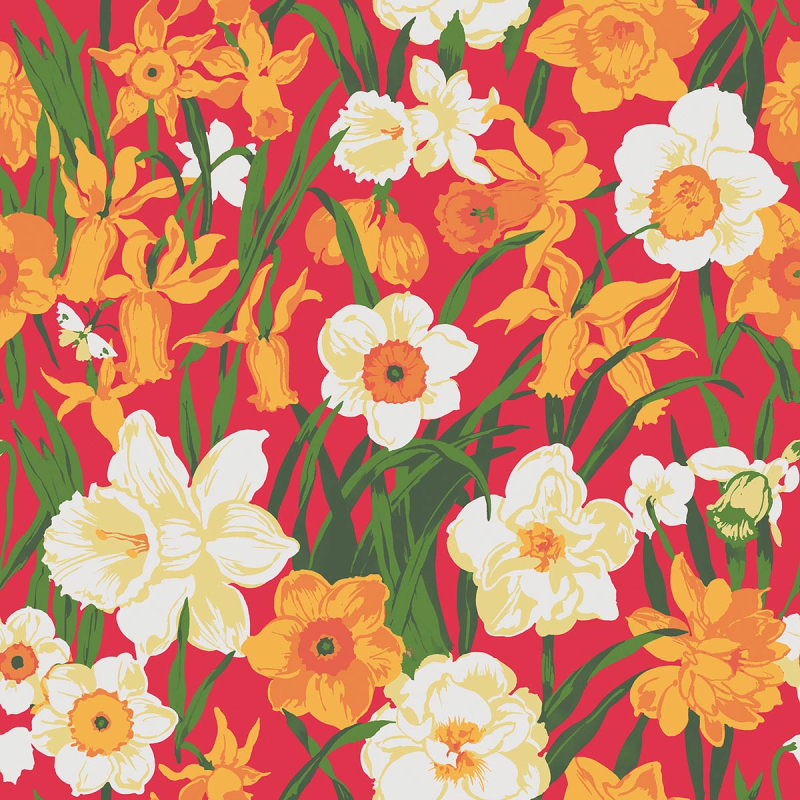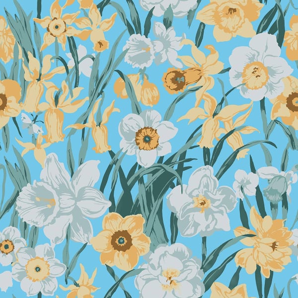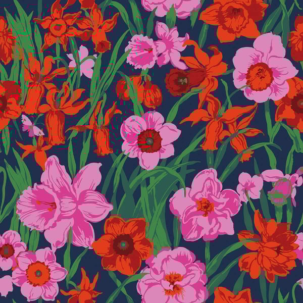 Édité par Inkiostro Bianco, Sanseverina célèbre la luxuriance d’un jardin éclatant. Narcisses et iris colorés s’y épanouissent, dans un tourbillon végétal ponctué de feuillages élégants. Ce papier peint floral dessine un décor d'une vitalité organique. Les contours francs des tiges et pétales accentuent l’élan de la composition chargée de contrastes.