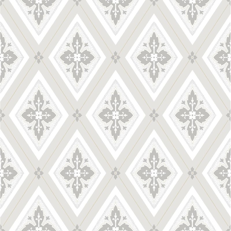 Astrid Flora déploie un rythme élégant de losanges enchâssant des ornements végétaux stylisés. Ce papier peint signé Düro présente un décor géométrique inspiré du damas, avec des arabesques adoucies aux accents traditionnels. Le quadrillage symétrique, souligné par de fins pointillés, s’anime d’intersections fleuries qui apportent du relief au dessin.
