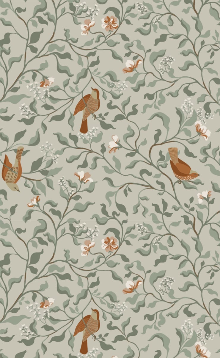 Le papier peint Josefin déploie un motif naturaliste où faune et flore cohabitent avec délicatesse. Les branches souples dessinent un réseau dense, ponctué de grappes de fleurs fines et écloses. De petits oiseaux perchés y trouvent refuge, rappelant le printemps en éveil. Cette composition imaginée par Düro restitue un décor à la fois graphique et végétal, entre mouvement et tranquillité.