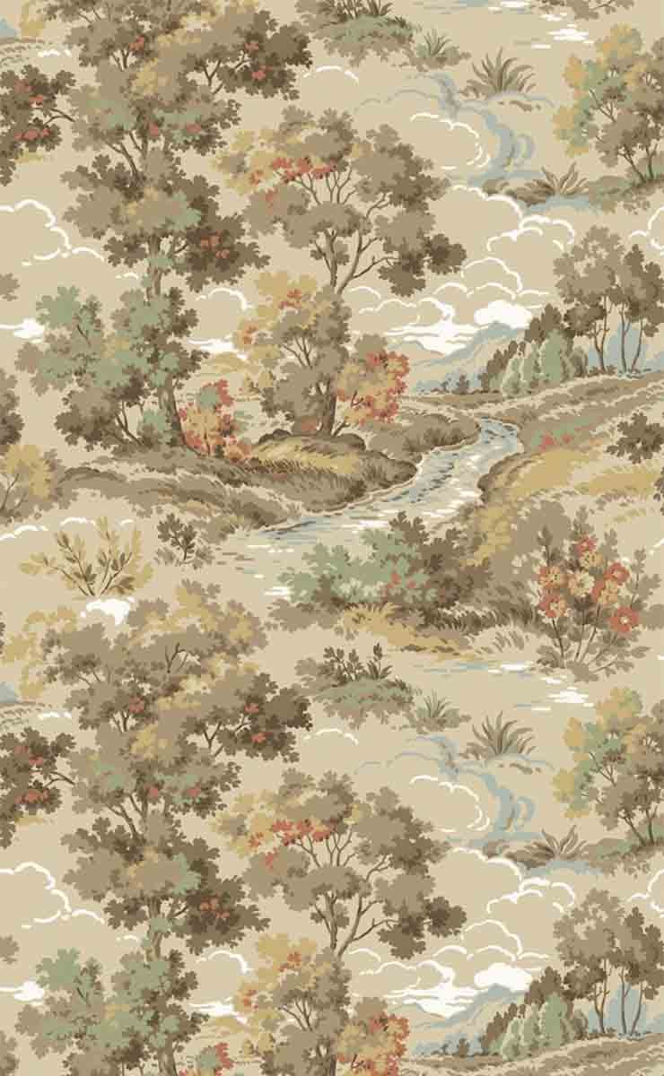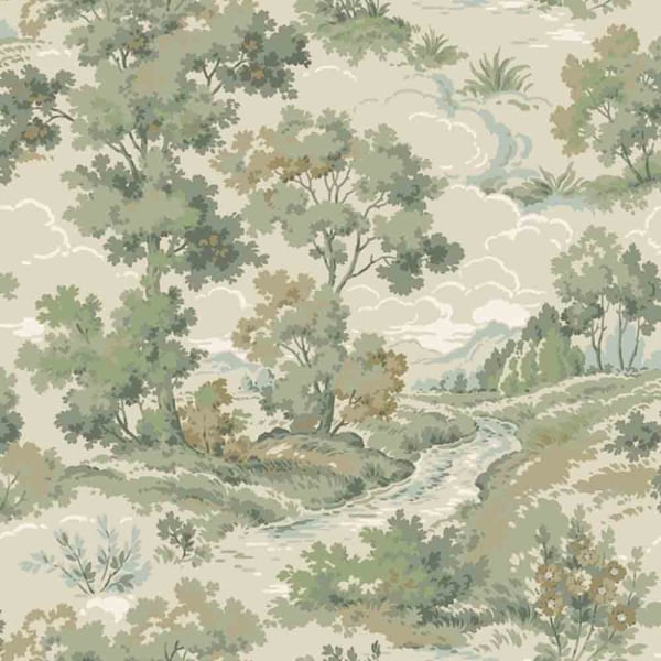 Boulognerskogen est un papier peint avec un dessin inspirant qui évoque une vision poétique de la campagne. Un ruisseau serpente entre les arbres feuillus, sous un ciel habité de nuages stylisés. Ce motif romantique lié à la nature et au paysage était très populaire dans les années 1940. La maison Düro perpétue ici un savoir-faire qui rend hommage à un art mural classique.