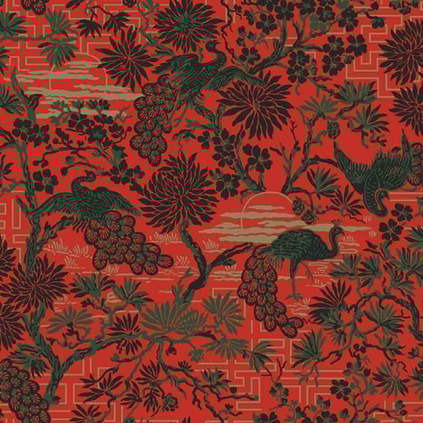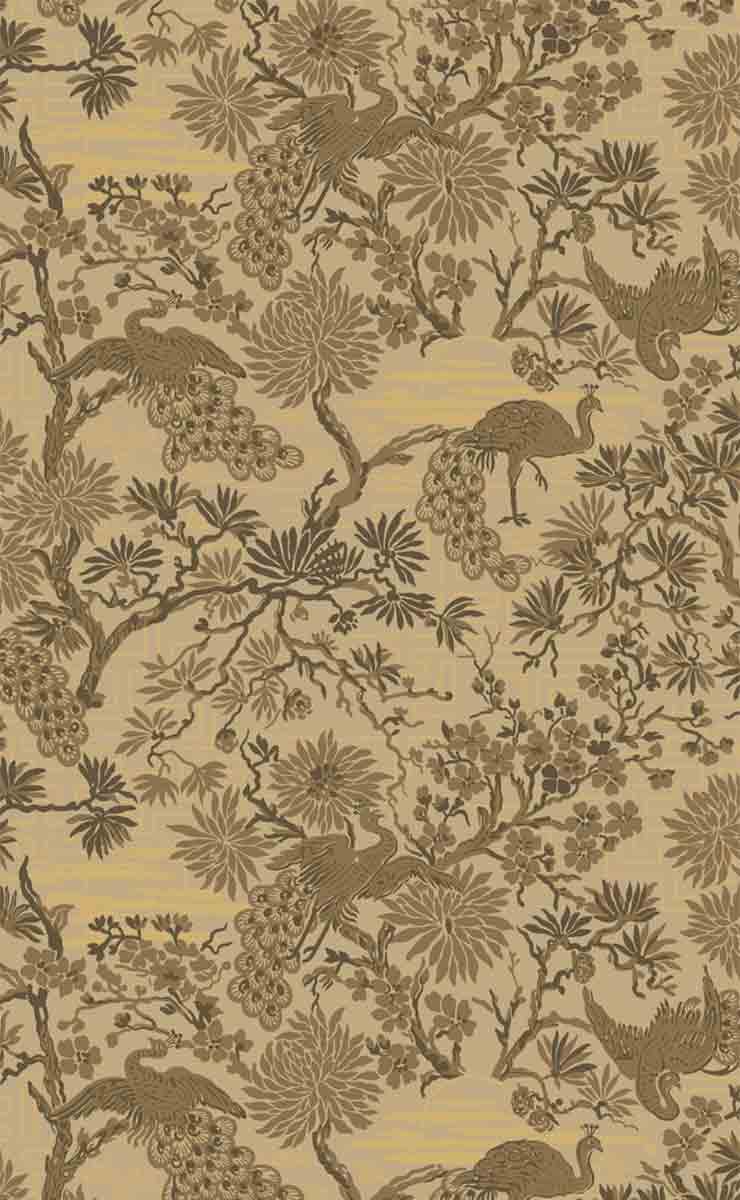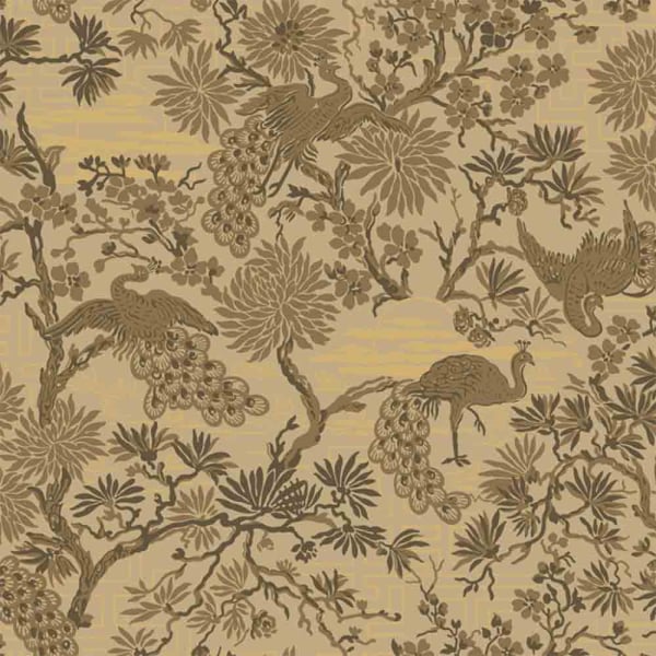 Le papier peint Brunnsgatan présente un dessin inspiré des influences orientales en vogue dans les années 1920-1930. Des paons aux plumages foisonnants y évoluent dans un décor foisonnant de branches fleuries et de feuillages stylisés. Cette composition dense et rythmée, signée Düro, est empreinte d’un exotisme fantasmé.