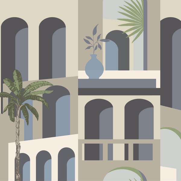 Le papier peint Monte Vista transpose un univers bâti imaginaire en un jeu de volumes et de courbes. Son motif architectural mêle arches élancées, balcons superposés et feuillages tropicaux dans une composition graphique saisissante. L'ensemble évoque des scènes méditerranéennes comme figées dans une ambiance abstraite. Réalisée par York Wallcoverings, cette interprétation géométrique inspire calme et équilibre.