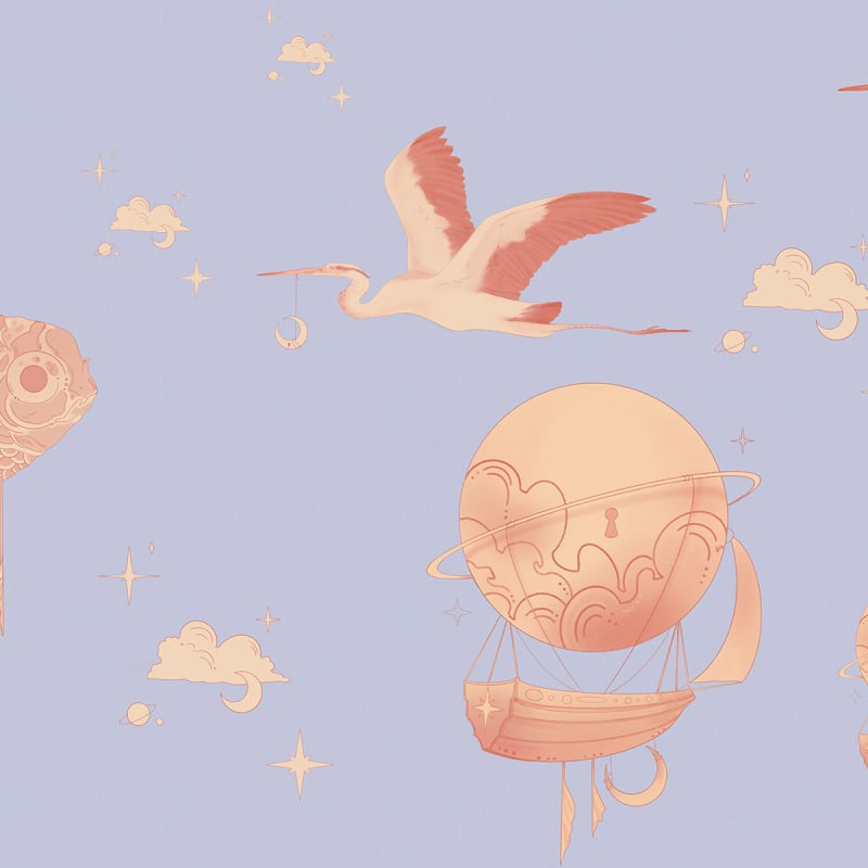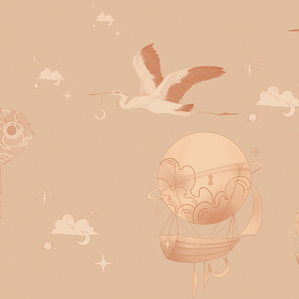 Mechanica dessine un monde suspendu entre ciel et machine. Ce papier peint panoramique présente un univers peuplé de poissons mécaniques, de montgolfières planétaires et d’oiseaux en plein vol. Animalier et fantastique, le motif regorge de détails délicats, entre engrenages apparents et constellations flottantes. La finition en impression numérique révèle toute la richesse visuelle de cette création signée Inkiostro Bianco.