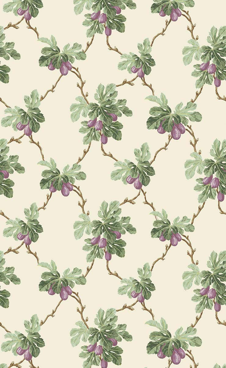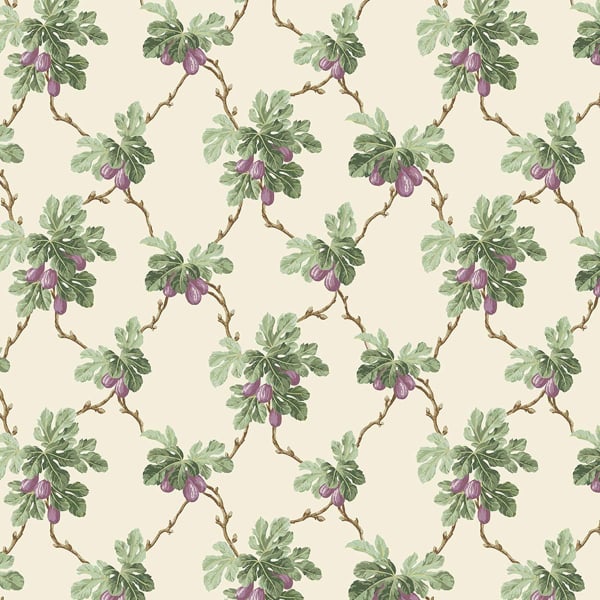 Figuier est un papier peint au motif botanique, signé Isidore Leroy. Des branches s’entrelacent en treillage régulier, ornées de larges feuilles finement découpées et de figues charnues. Le motif évoque une nature stylisée, généreuse et structurée. Il met en valeur la finesse du tracé, la richesse des détails et l’harmonie de la composition.