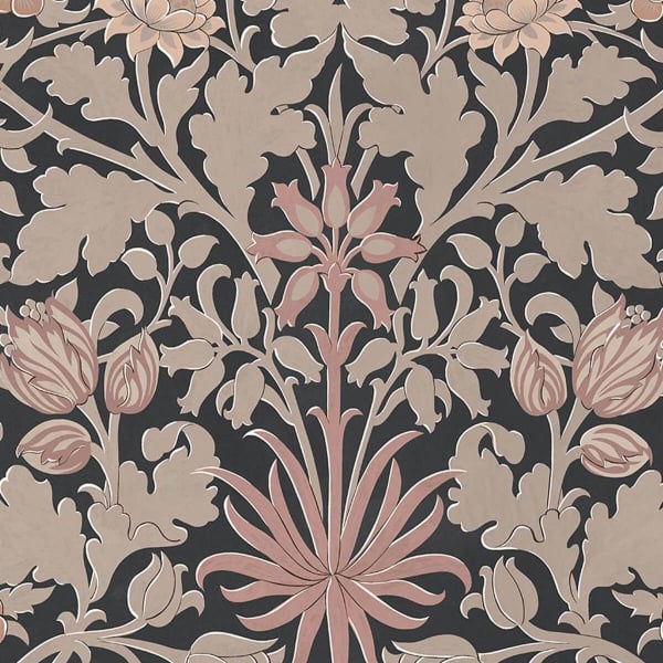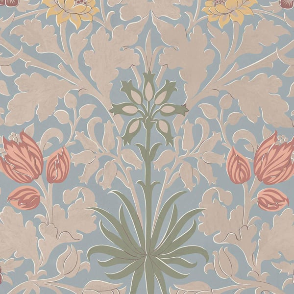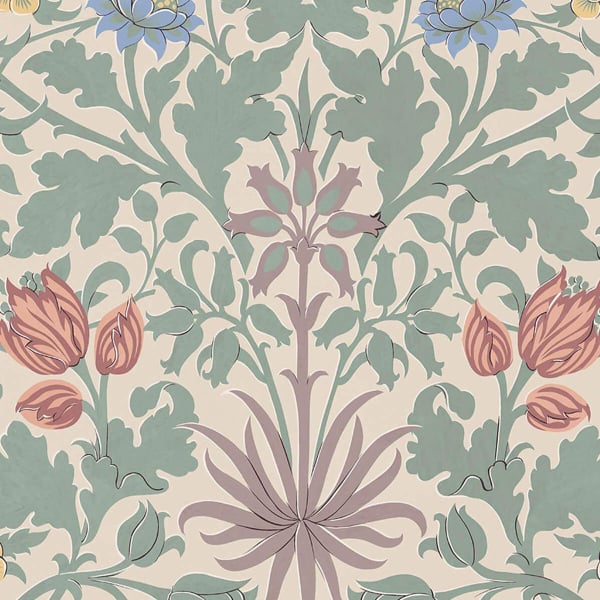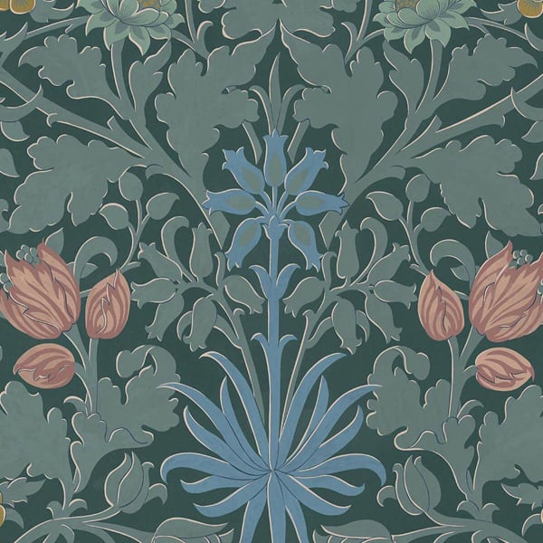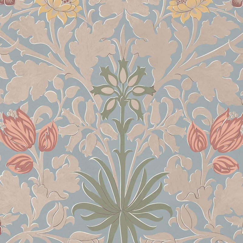 Le papier peint Hyacinth déploie une arabesque de fleurs aux formes généreuses. Clochettes de jacinthe, tulipes fermées et feuilles d’acanthe s'entremêlent dans cette trame régulière aux accents végétaux marqués. Chaque élément est dessiné avec une précision qui capte la nervure, le galbe et le mouvement naturel. House of Hackney compose ici une fresque ornementale riche, où la rigueur graphique dialogue avec l’abondance botanique des dessins de William Morris.