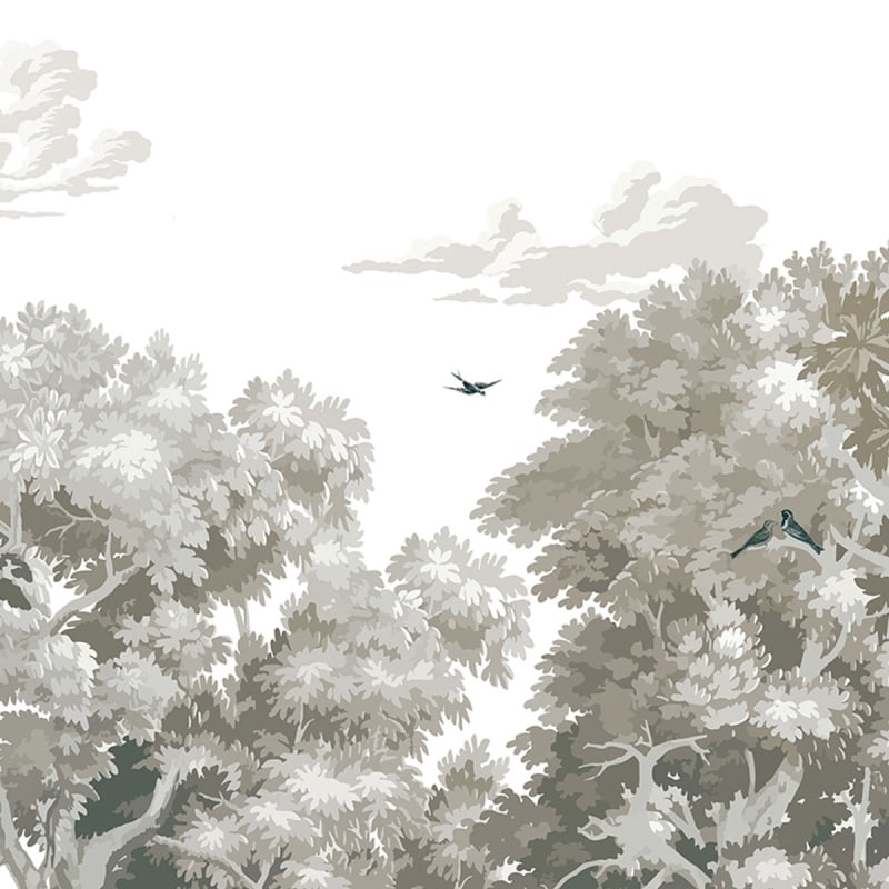 Misty Forest est un papier peint panoramique dont le motif paysager esquisse une jungle brumeuse, habitée d’oiseaux furtifs. La composition offre une profondeur captivante, entre ciel immobile et ramures entremêlées. Chaque arbre dévoile une singularité, dans une harmonie feutrée. Les Dominotiers imagine ici une scène immersive, comme suspendue dans le silence d’une nature grandiose.