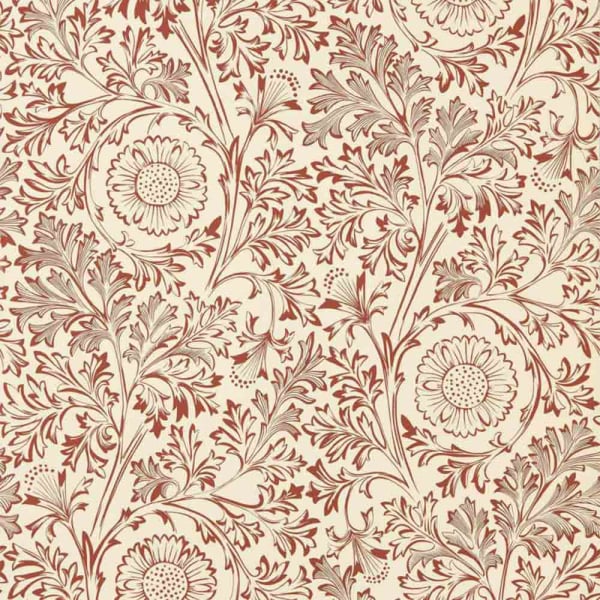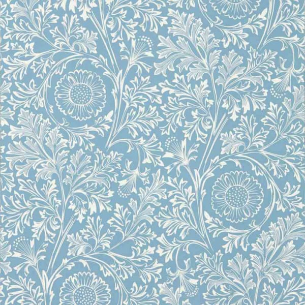 Le papier peint Chamomile dévoile un foisonnement végétal où de larges fleurs aux pétales ciselés s’épanouissent parmi des feuillages ondoyants. Chaque tige trace sa courbe avec délicatesse, insufflant un mouvement continu au motif. L’ensemble compose une structure rythmée, soulignée par le contraste subtil entre les lignes fines du dessin et le fond uni. Ce décor, riche en détails, porte la signature de Morris and Co.