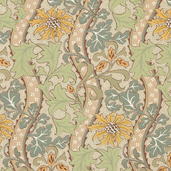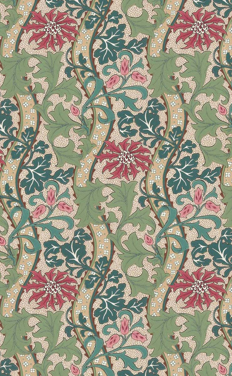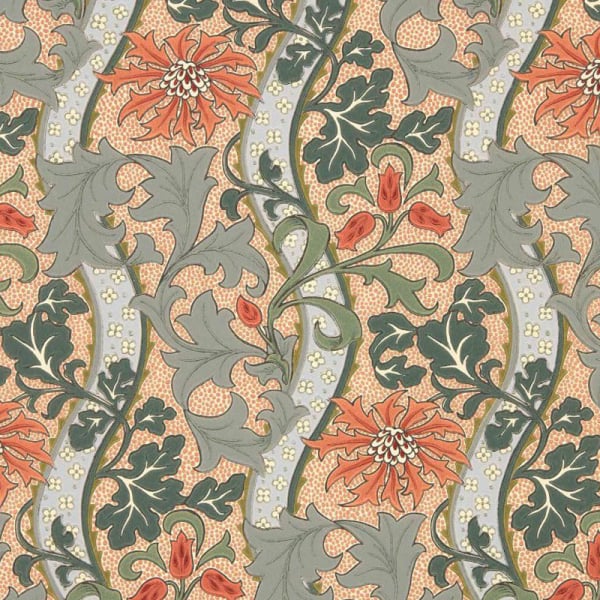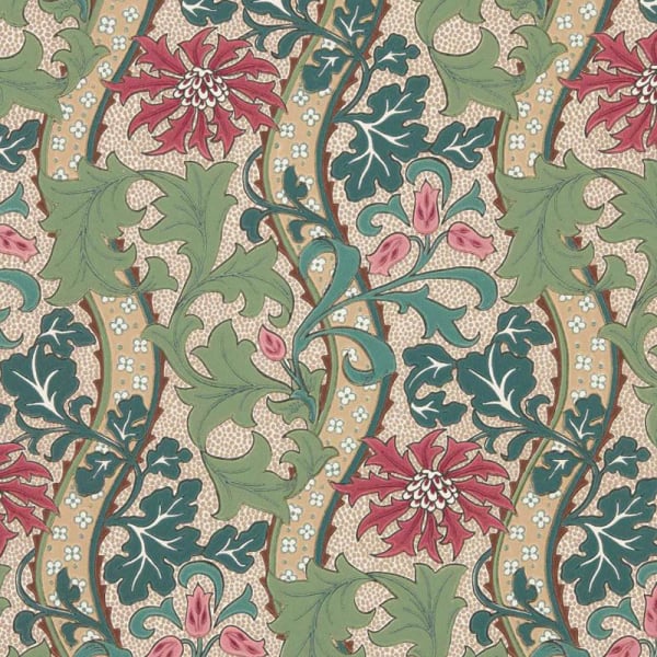 Des enroulements de feuillage tracent des lignes sinueuses verticales entrelacées de lianes et de fleurs stylisées. Le papier peint Cornflower expose un motif floral complexe, où les chrysanthèmes épanouis côtoient des tulipes en bouton, le tout rythmé par un fond constellé de minuscules points. La répétition du dessin crée une impression de mouvement régulier et dense. Chaque détail révèle l’influence du mouvement Arts and Crafts, dans une composition fidèle aux archives de Morris and Co.