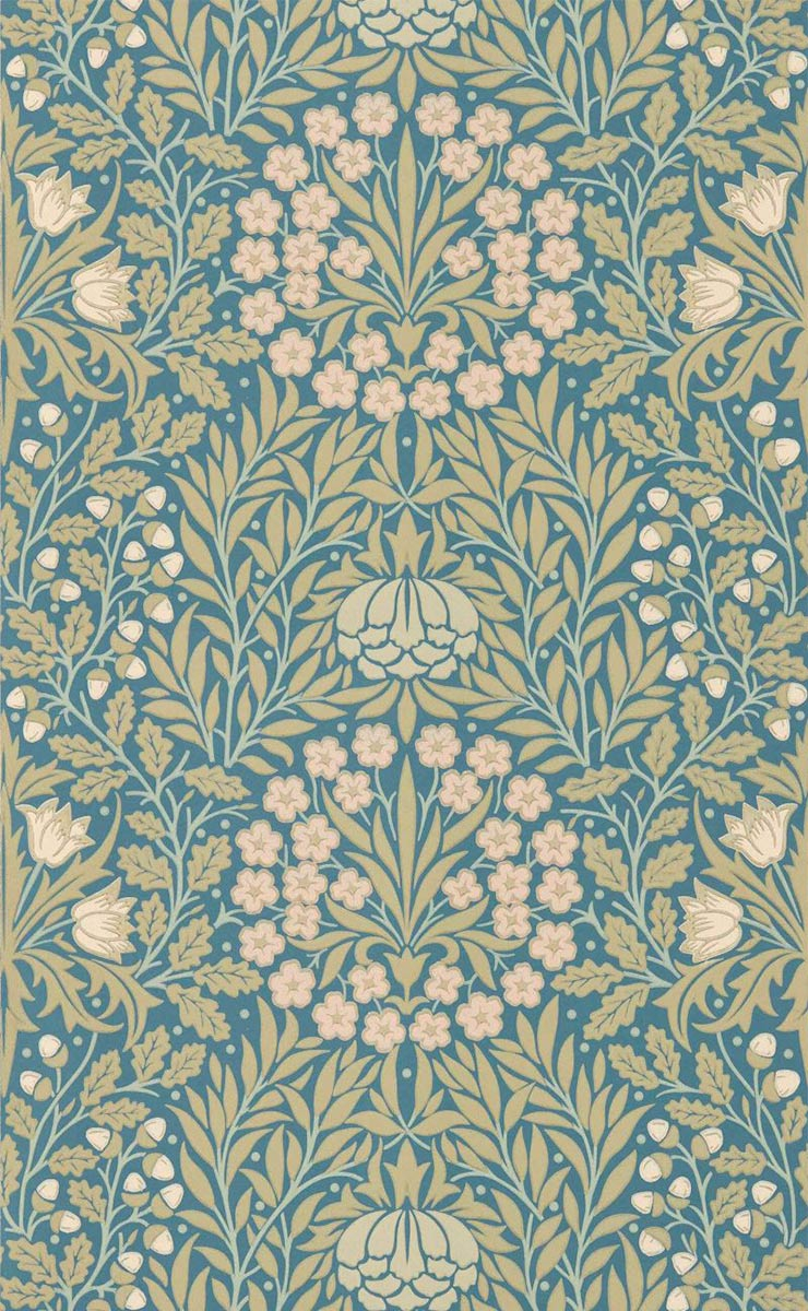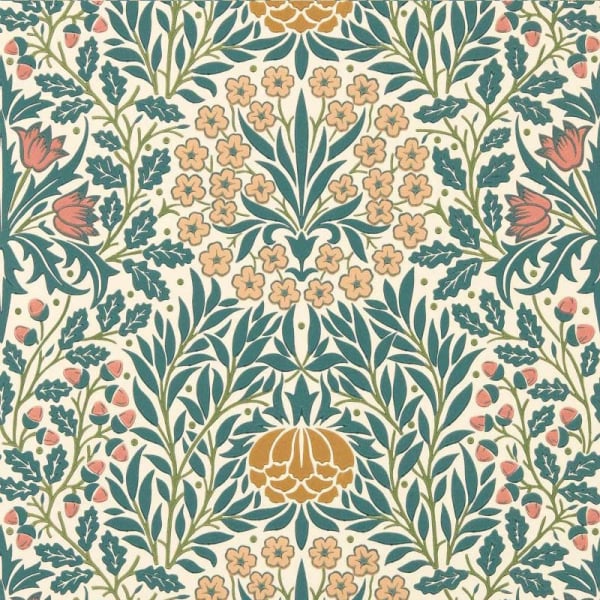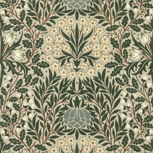 Le papier peint Daisy & Oak révèle un motif floral stylisé dans une structure savamment rythmée, typique du répertoire décoratif de Morris and Co. Les feuilles se dressent en bouquets géométriques, entourant des fleurs aux contours nets et délicats. Marguerites, chênes et boutons s’imbriquent dans une symétrie maîtrisée, révélant une végétation dense, presque ornementale. L’ensemble compose une scène végétale foisonnante, d’une grande richesse.