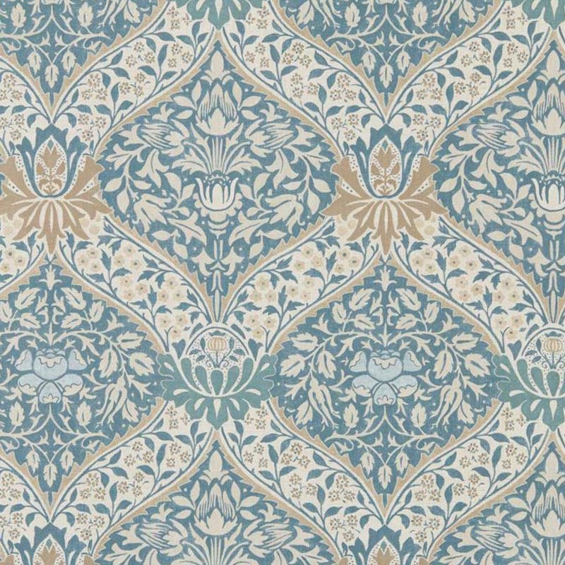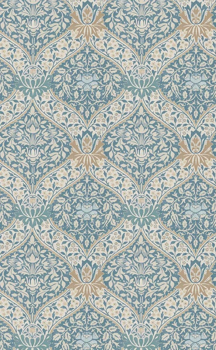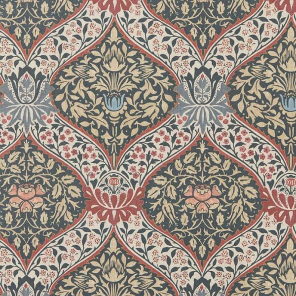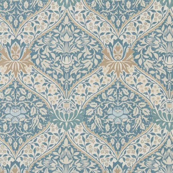 Le papier peint Norbury affiche un motif floral stylisé structuré par une trame de losanges évoquant les vitraux anciens. Chaque section renferme une composition végétale symétrique, foisonnante de feuilles sculptées et de corolles. Les fleurs s’épanouissent dans un ordre précis, encadrées par des guirlandes feuillues et des détails ornementaux. La géométrie du dessin donne un rythme régulier à cette création signée Morris and Co.