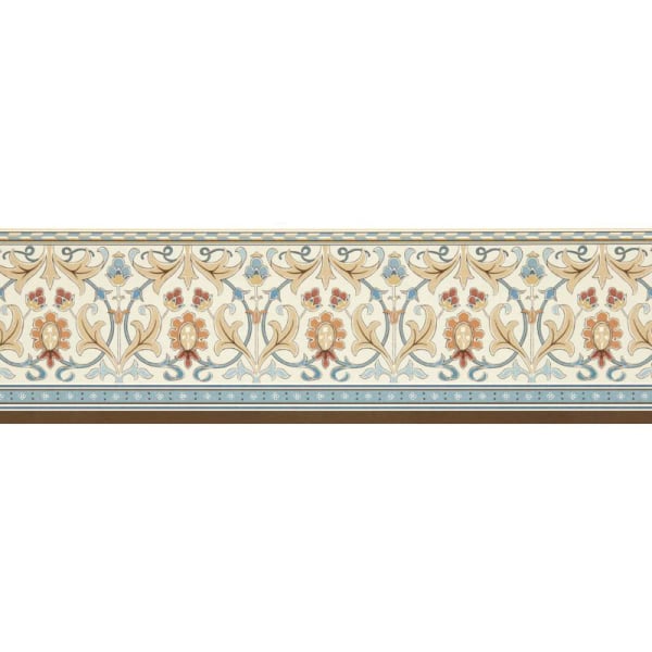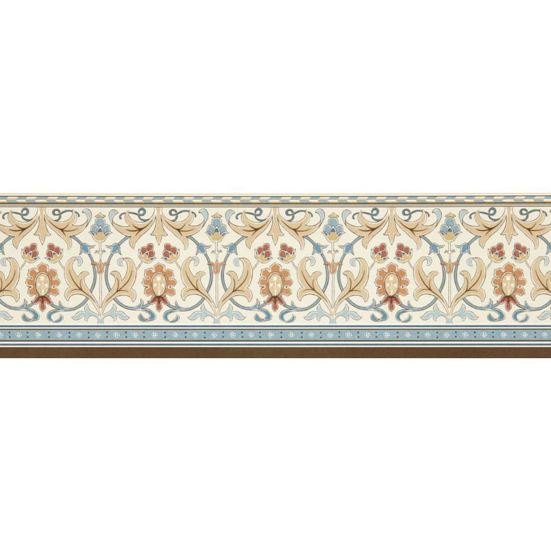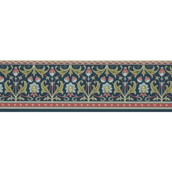 Ornamental Frieze est une frise décorative éditée par Morris and Co. Des fleurs stylisées s’élèvent sur un réseau de tiges ondulantes, encadrées de feuilles sinueuses et de couronnes végétales. Le motif central se répète avec rigueur, alternant des figures florales en médaillon et des bouquets de boutons. L’ensemble est rythmé par une composition en miroir, renforcée par deux bordures géométriques qui structurent l’espace.
