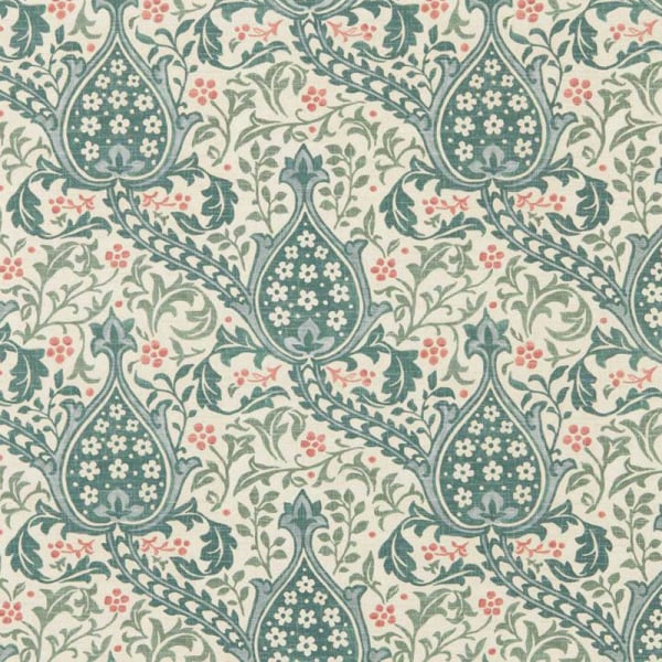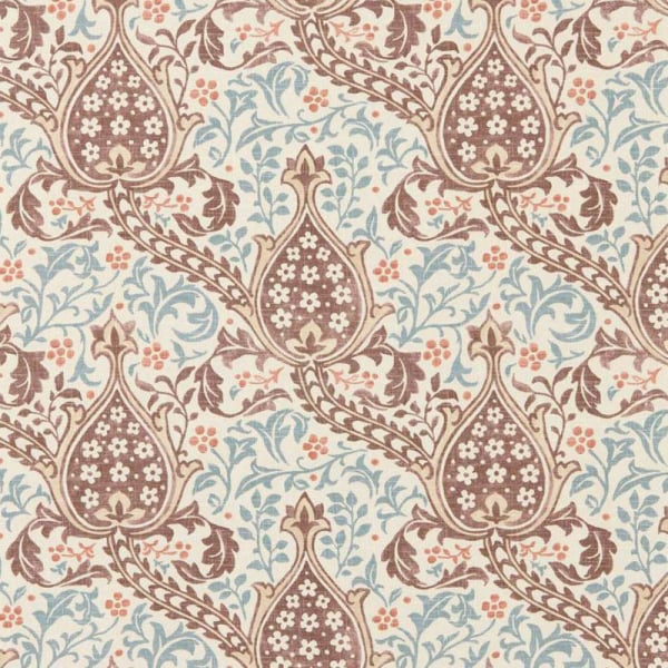 Persian Tulip est un papier peint à motif floral inspiré des dessins persans anciens, réinterprétés avec une sensibilité artistique propre à Morris and Co. La composition s’organise autour de capsules en amande garnies de petites fleurs, reliées par des tiges souples qui serpentent entre feuilles et corolles. Chaque détail végétal s’inscrit dans une symétrie subtile, créant un décor rythmé et vivant.