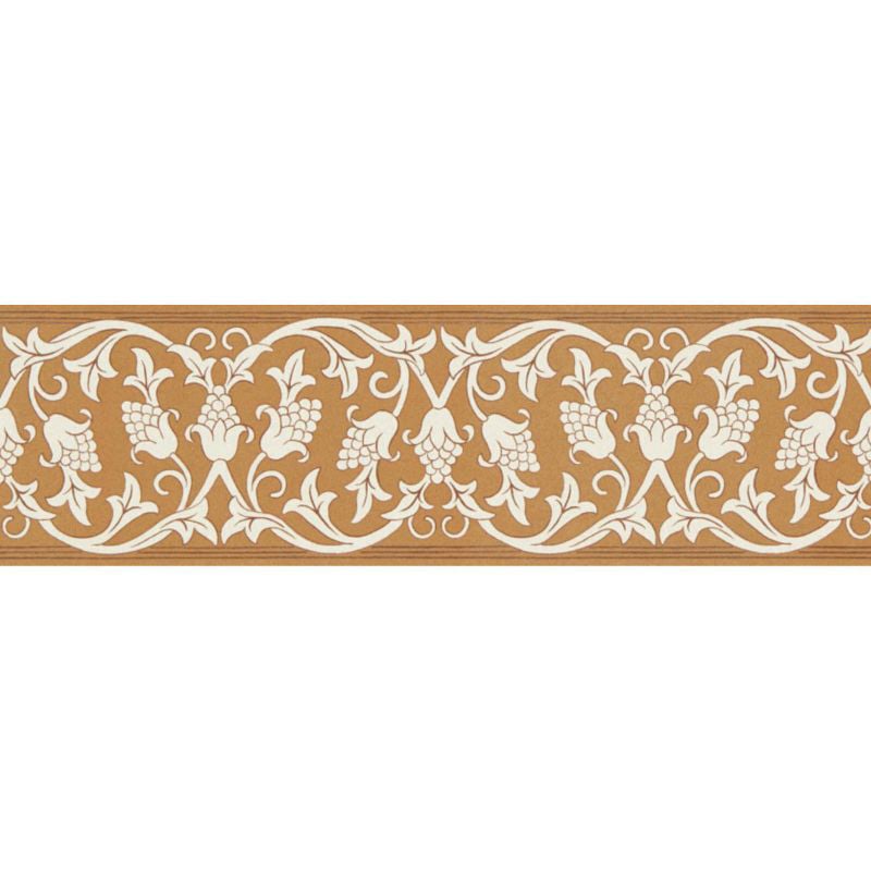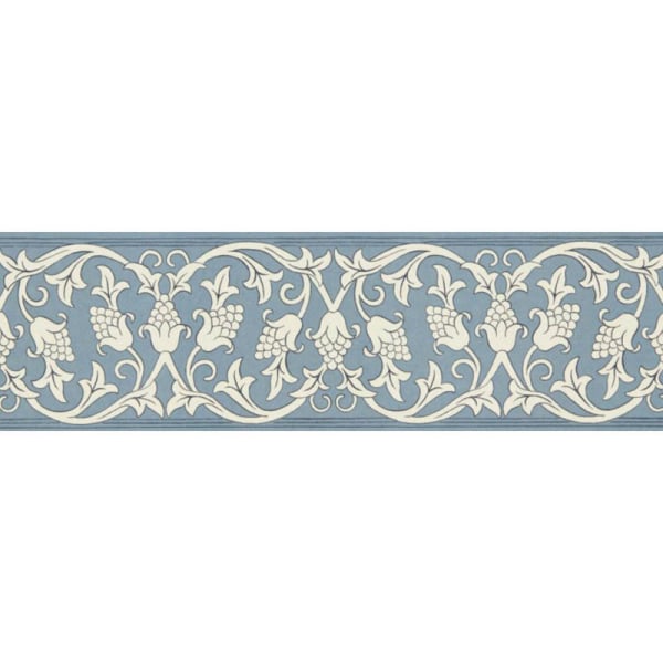 La frise St Johns Border expose un motif ornemental inspiré des codes victoriens et du mouvement Arts & Crafts. Des grappes de raisin stylisées alternent avec des feuilles élancées, formant une succession rythmée de figures végétales. Les lignes s’enroulent en volutes symétriques, créant un enchevêtrement dense et raffiné. Cette création reflète le savoir-faire propre à Morris and Co, où chaque détail est conçu avec une attention méticuleuse.