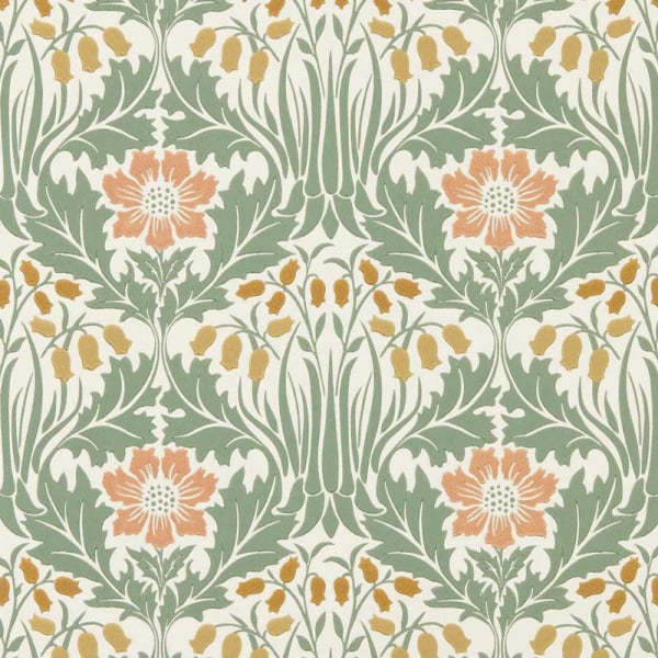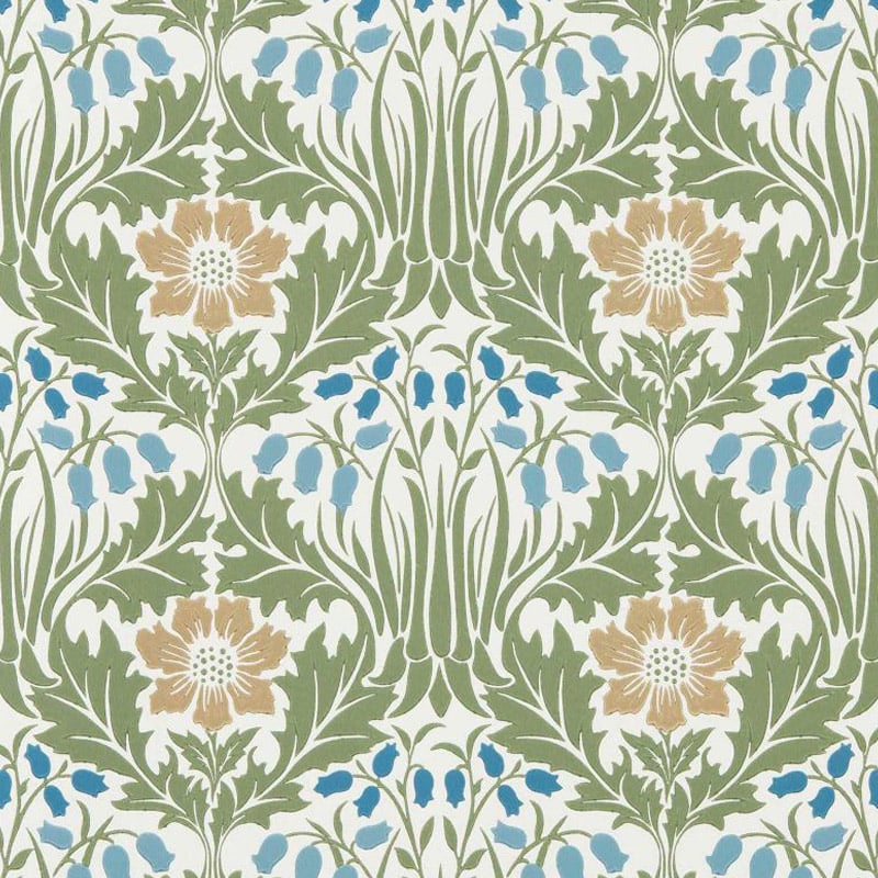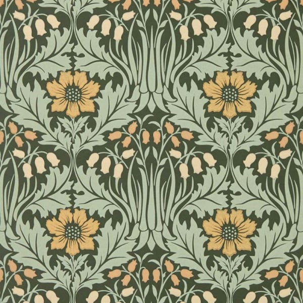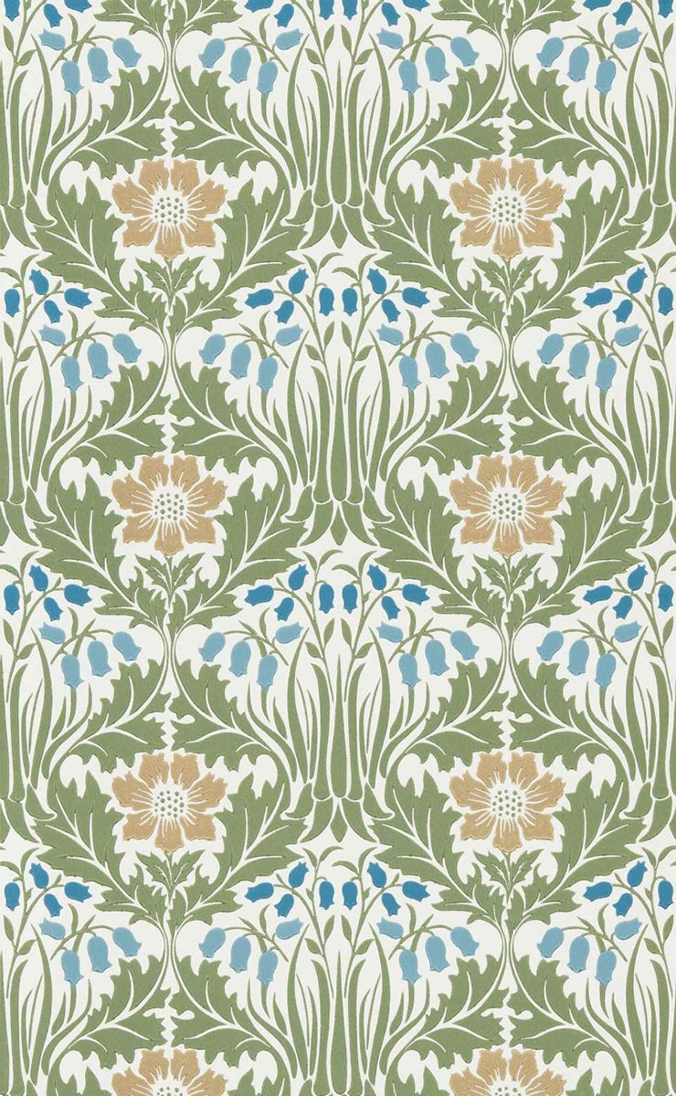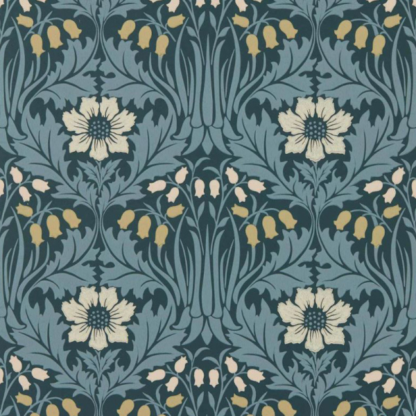 De grandes anémones aux pétales arrondis s’épanouissent parmi des tiges souples, accompagnées de grappes de clochettes délicatement inclinées. Le papier peint Woodbell & Anemone déploie un motif floral harmonieux, où chaque forme végétal s'intègre dans une composition mesurée. Les feuilles élancées, finement dentelées, montent en gerbes verticales et dessinent un enchaînement rythmique. Morris and Co compose une surface riche, où la répétition donne une sensation de continuité et de mouvement.