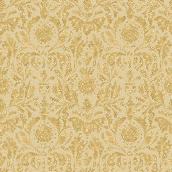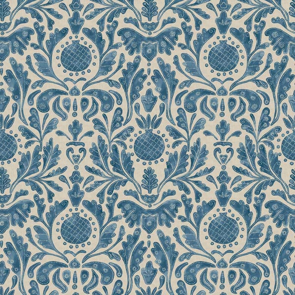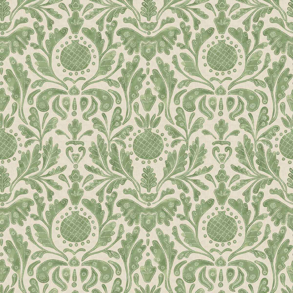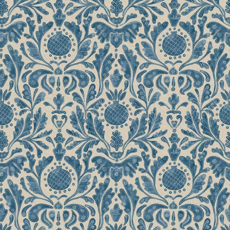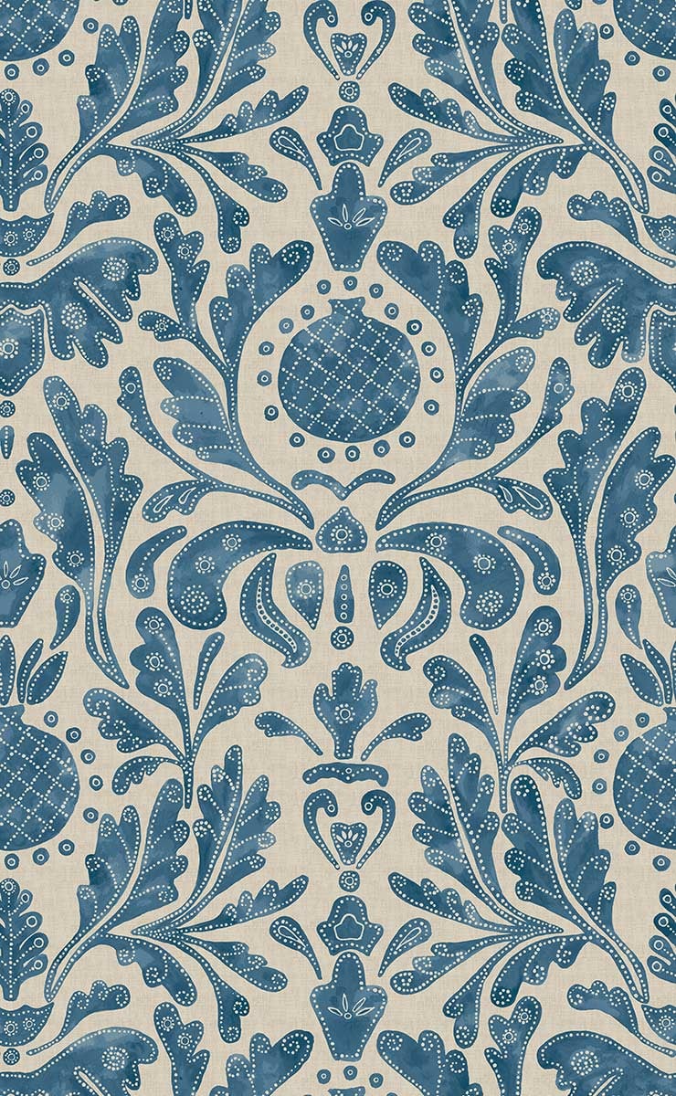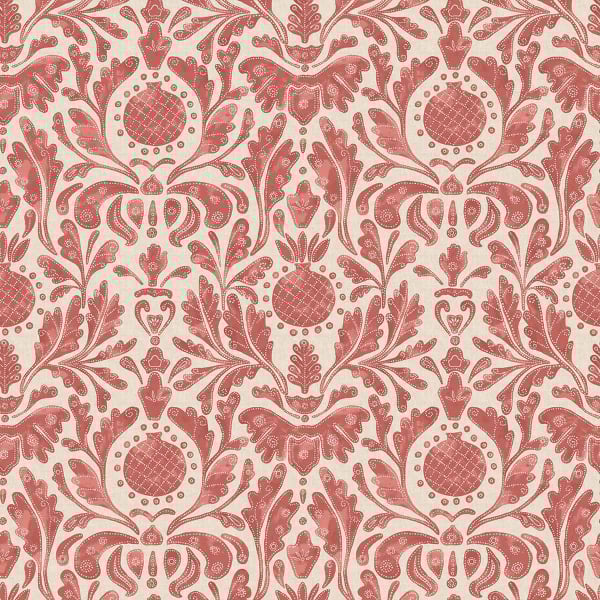 Castellane présente un motif damassé végétal où la forme stylisée de la grenade dialogue avec un feuillage ornemental. Ce papier peint imaginé par Nina Campbell déploie une symétrie décorative inspirée des textiles anciens. Chaque élément est souligné par de petits pois qui structurent l’espace avec finesse. L’ensemble évoque une composition florale symbolique, à la fois dense et raffinée.