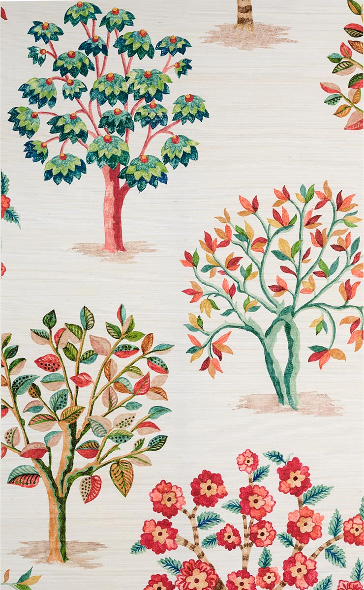 Le papier peint Fener Grove Sisal de Nina Campbell déploie un motif végétal représentant une série d'arbres stylisés. Les troncs marqués, les feuillages texturés et les floraisons exubérantes composent une scène botanique pleine de fantaisie. Chaque silhouette évoque une saison, un mouvement, une structure unique. Ce décor illustre une approche sensible de la nature à travers la richesse des formes organiques.