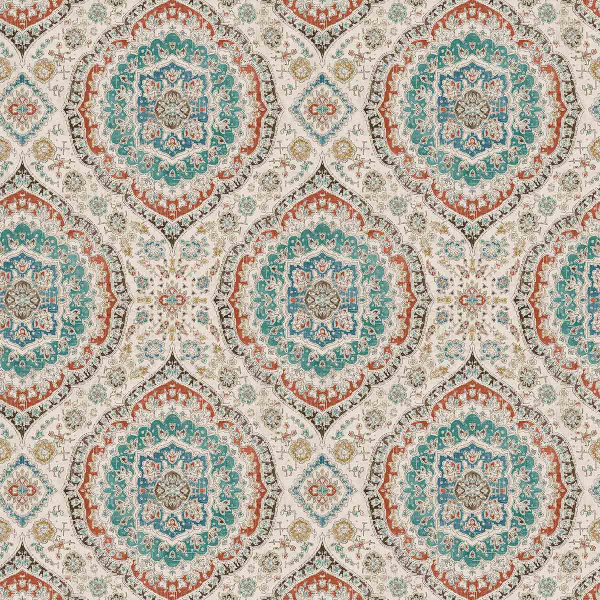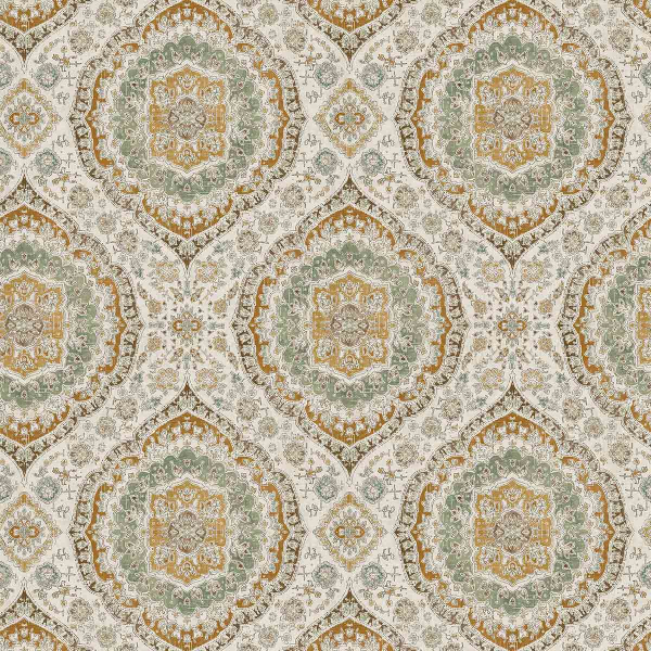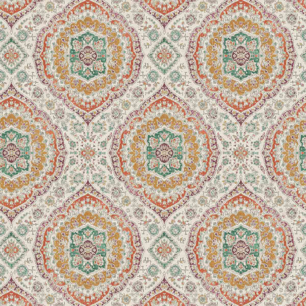 Karabali est un papier peint structuré autour d’un motif en médaillon d’inspiration persane. Chaque élément foisonne de détails, entre compositions florales stylisées et figures géométriques ciselées. L’agencement régulier forme une surface rythmée, proche d’une mosaïque raffinée. Nina Campbell restitue ici l’esprit des traditions décoratives orientales avec une excellente justesse graphique.