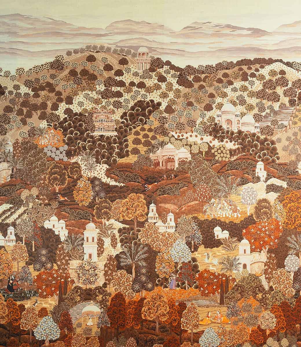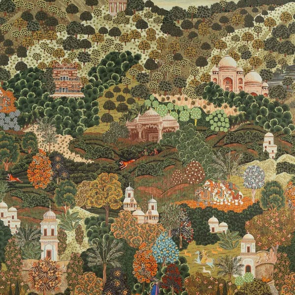 Sundara est un papier peint panoramique au motif de paysage luxuriant inspiré du Rajasthan. Des temples, des forêts stylisées et des éléphants ornés composent une scène dense et narrative. La maison Arte recourt à une impression numérique qui révèle la finesse du dessin. Chaque élément s’inscrit dans un décor vivant, où l’ornement devient récit.