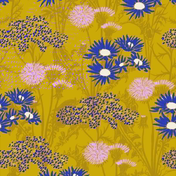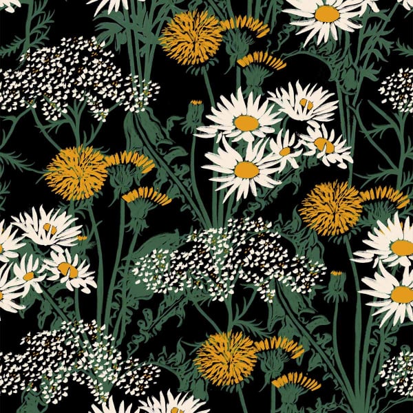 Un motif floral stylisé parcourt le papier peint Picnic, édité par Coordonné. Des ombelles vaporeuses, des chardons graphiques et des marguerites épanouies s’enchevêtrent dans un jardin luxuriant. Les tiges, esquissées avec minutie, soutiennent les corolles nervurées. Le dessin, posé sur un fond uni, capture le mouvement spontané de la flore sauvage.