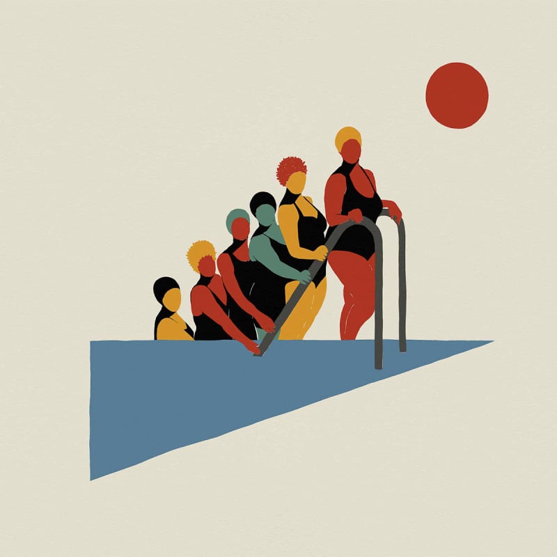 Le papier peint Equilibrio affiche un groupe de nageuses figées dans une attente calme, comme prises entre deux époques. Le motif figuratif montre des silhouettes alignées sur un plongeoir aux formes géométriques. Il suggère un souvenir collectif, une mémoire partagée d’amitiés durables. Ce revêtement signé Coordonné joue sur la force des aplats colorés et la simplicité du dessin.