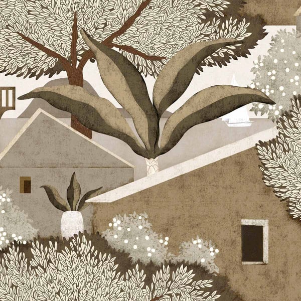 Un motif paysager s’étend sur le papier peint Nopolo imaginé par Coordonné. Telle une œuvre architecturale, un village aux façades colorées, baigné de lumière, évoque un désert paisible. Une végétation dense, composée de cactus géants, arbres massifs et plantes exotiques, structure l’ensemble dans un équilibre graphique. Ce revêtement forme une scène intemporelle aux textures douces.