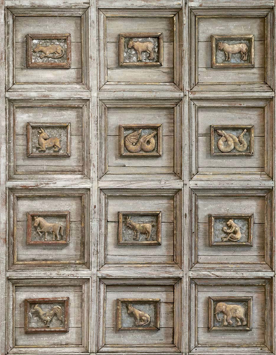 La carta da parati Zodiac reinterpreta gli ornamenti di un soffitto in legno intagliato, originario dell'antica Cina. Il suo motivo figurativo raffigura dodici creature zodiacali incastonate in cornici patinate. Andrew Martin ricrea con delicatezza questa architettura sacra, rustica ed enigmatica al tempo stesso.