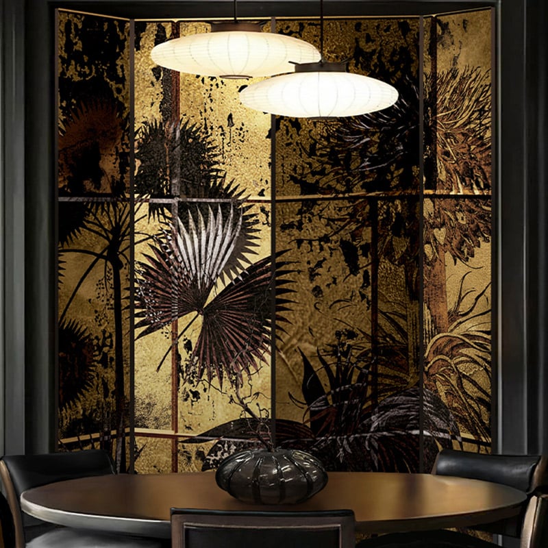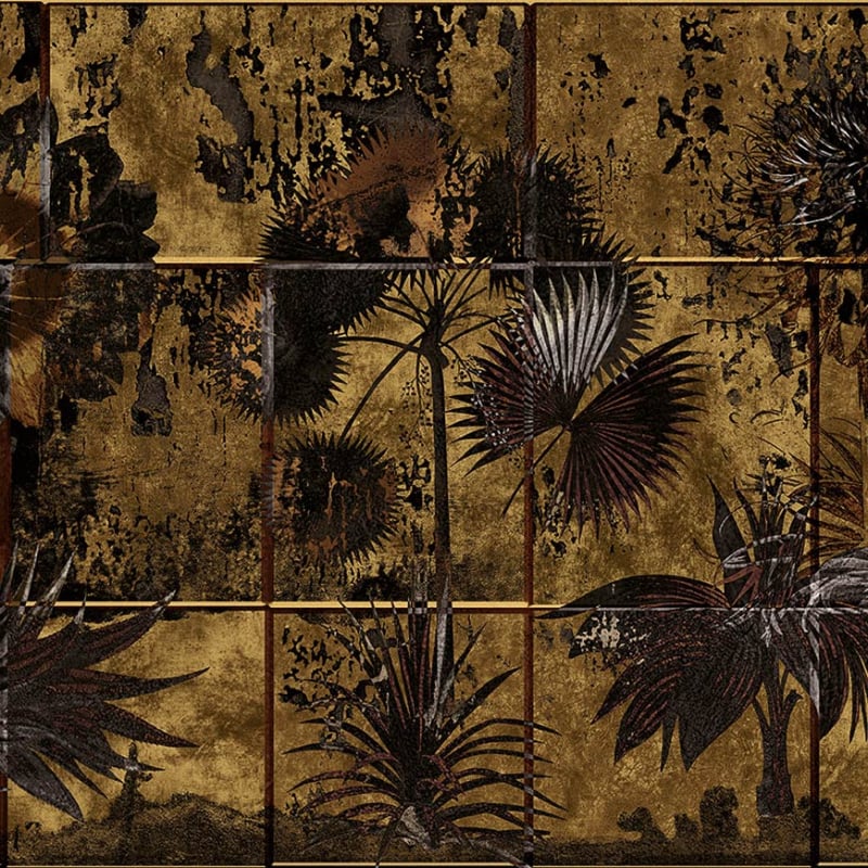 Un motif botanique au style mystérieux parcourt le papier peint panoramique Notturno Special. De grandes plantes exotiques aux feuillages épineux et aux silhouettes sculpturales se détachent sur un fond patiné doré. Le dessin, réparti en panneaux, rappelle un décor mural fragmenté. Réalisé par Code, ce revêtement invite à une contemplation silencieuse et profonde.