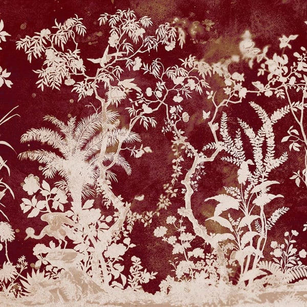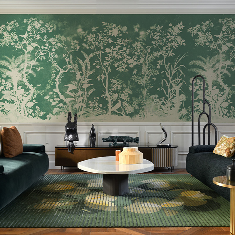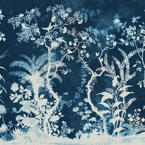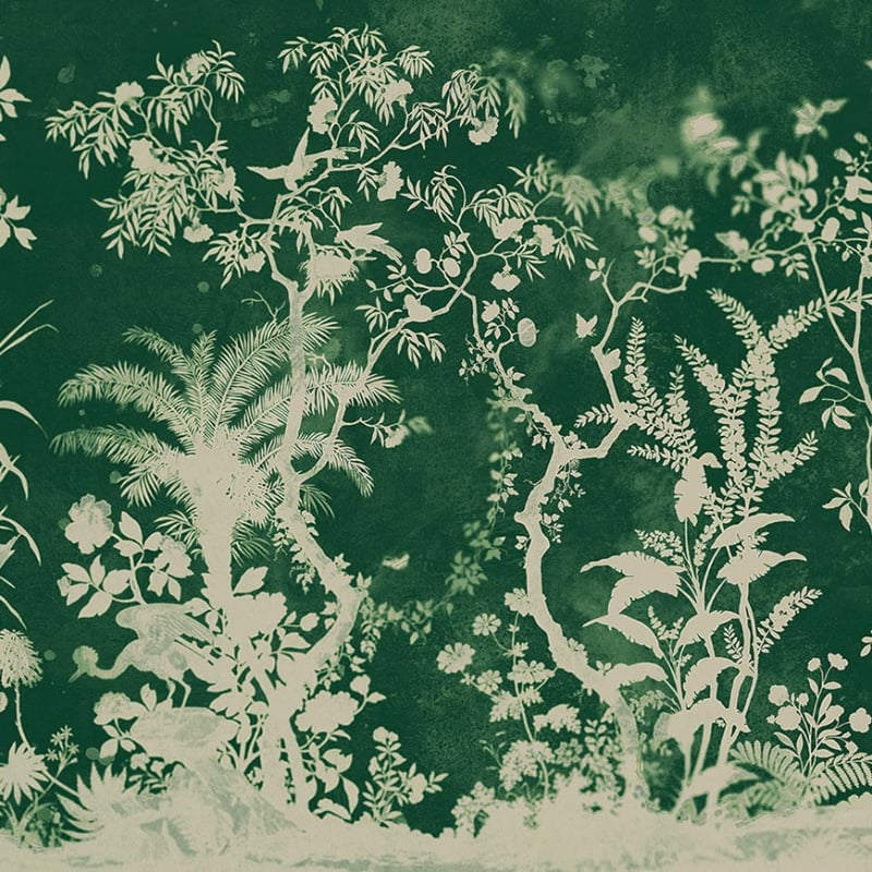 Edité par Code, le papier peint panoramique Inno trace un paysage botanique stylisé qui rappelle la tradition de la chinoiserie. Le motif végétal, composé de feuillages aériens et de palmiers graciles, se déploie avec précision. La forêt onirique dissimule des oiseaux figés dans l’immobilité. Ce revêtement harmonieux, riche en détails, fait surgir un univers suspendu.