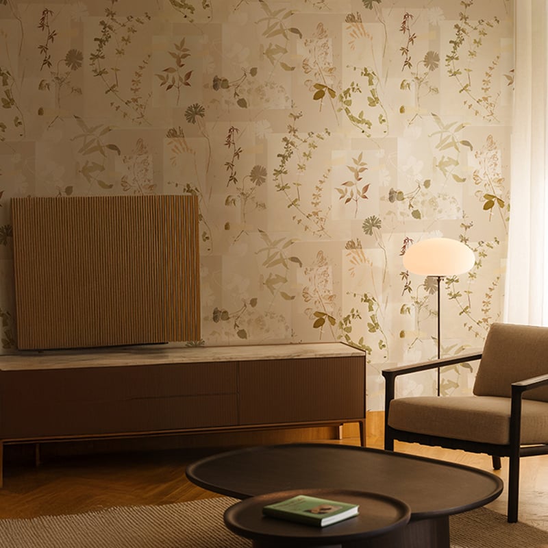 Sur le papier peint panoramique Rapsodia, les plantes se figent comme dans un herbier ancien. Des silhouettes fines, des feuillages délicats et des fleurs séchées se superposent en un collage graphique. Fragmenté en carrés et rectangles, le motif botanique restitue avec précision la structure des formes naturelles. Code inscrit cette composition dans une esthétique sensible et poétique.