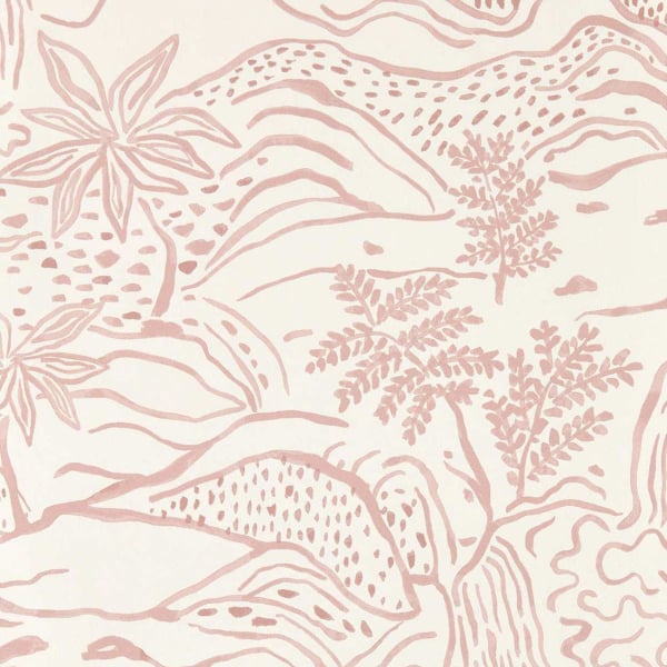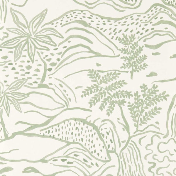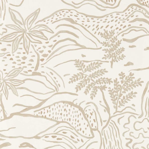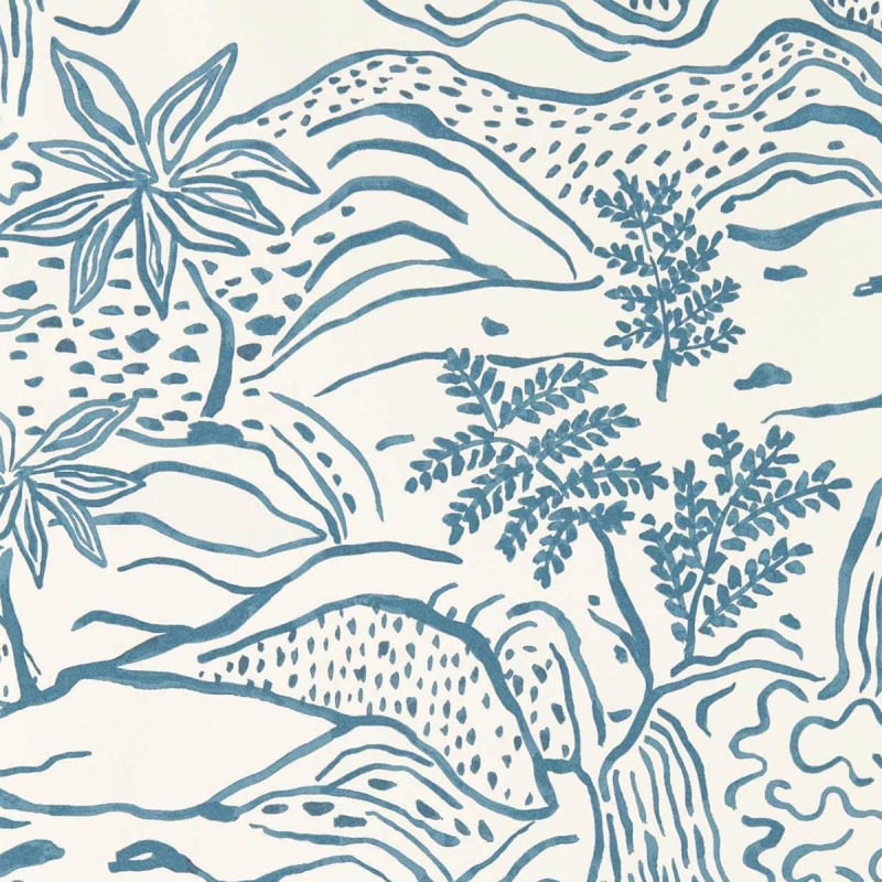 Des courbes larges dessinent un motif de paysage abstrait sur le papier peint Falling Foss de Scion. La scène alterne collines, points, rivières et végétaux schématisés en aplats. Inspiré d’un dessin destiné à un tissage jacquard, le décor affiche une ligne souple et instinctive. Chaque élément graphique est simplifié, laissant apparaître des arbres, des rochers et des reliefs dans une composition ouverte et équilibrée.