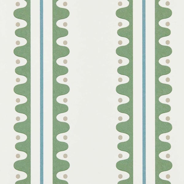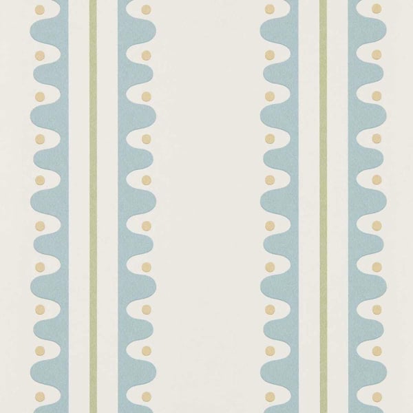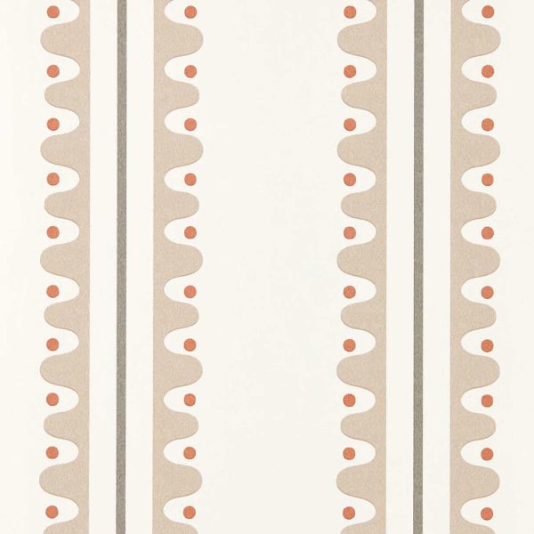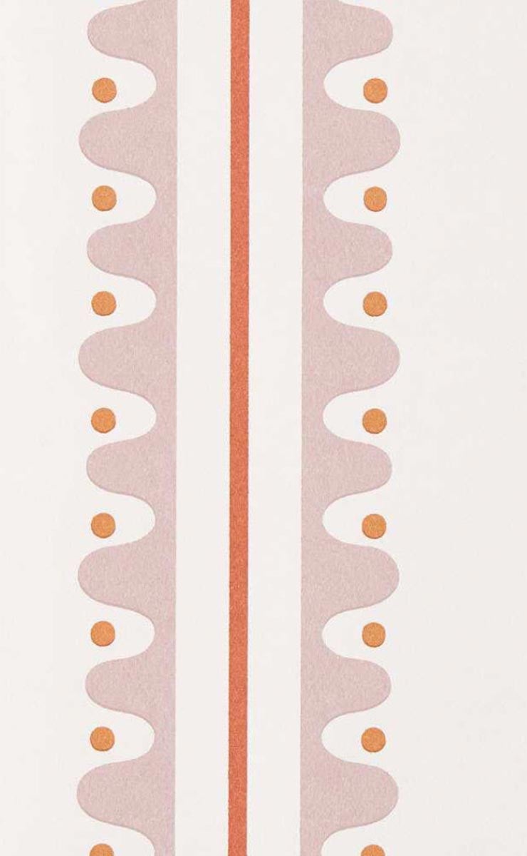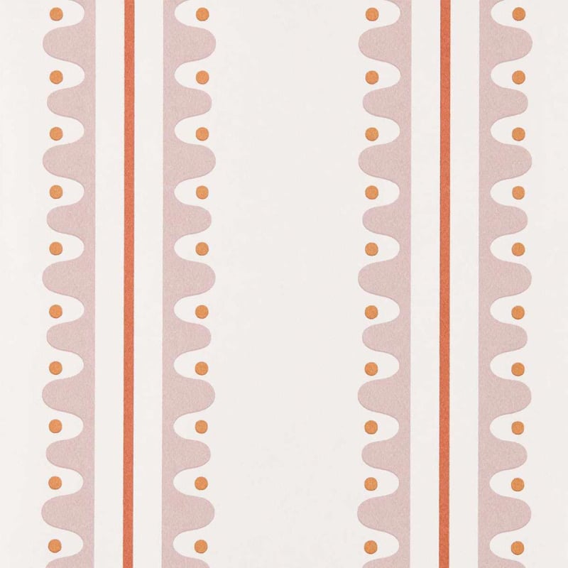 Oakham est un papier peint créé par Scion. Son motif géométrique présente une alternance de bandes verticales composées d’une forme ondulée régulière, ponctuée de petits points circulaires. Ces derniers sont parfaitement alignés au centre des courbes, créant un rythme fluide et structuré. Le décor, inspiré d’un travail de crémaillère, reprend un agencement linéaire à grande échelle, dans une composition répétitive et ordonnée.