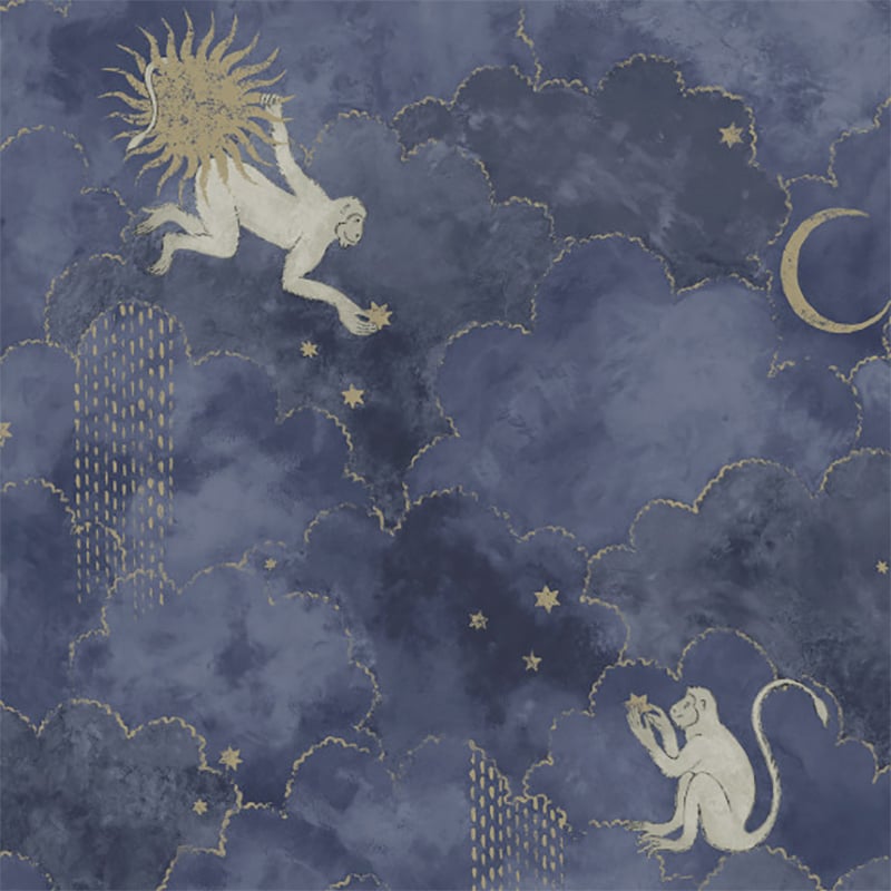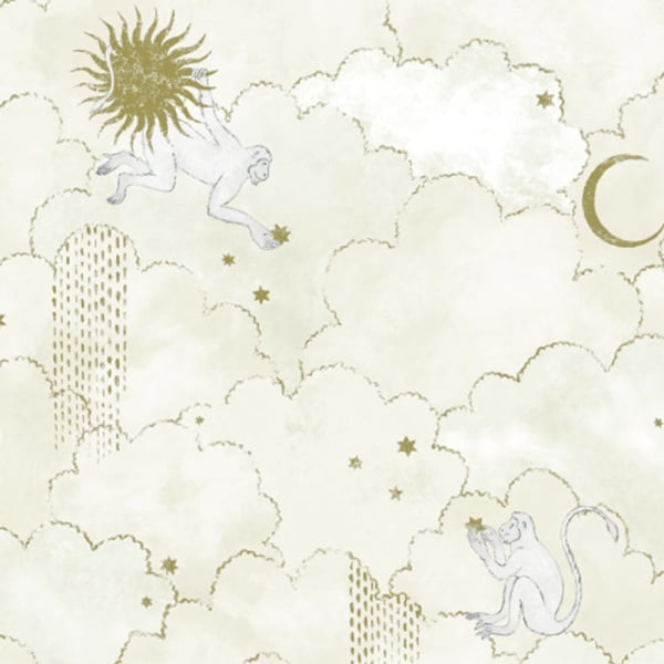 Le papier peint panoramique Grand Stars Monkeys dévoile un univers céleste aux contours dessinés à la main. Des singes au pelage pâle explorent un ciel de nuages moelleux, constellé d’étoiles, de pluies dorées et d’astres mystérieux. Le motif imaginaire évoque une fable cosmique, suspendue entre rêve et mythe. Réalisé par Les Dominotiers, chaque détail révèle la poésie graphique d’un monde onirique.