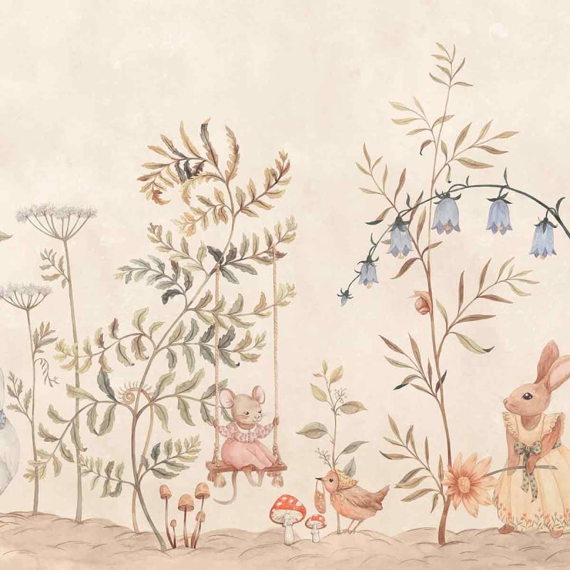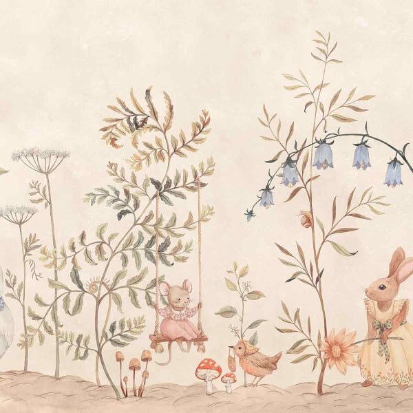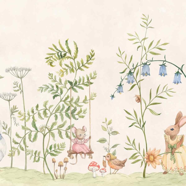 The Vilhelmina panoramic wallpaper evokes an enchanted garden populated by tenderly humanized animals. A duck adorned with a bow, a mouse hanging from a swing, or a dreamy bird animate this bucolic scene. The narrative motif mixes light flora and childlike figures in a soft composition. Proposed by Sandberg, this decor opens an imaginary parenthesis on the walls, like an illustrated page from a fairy tale.