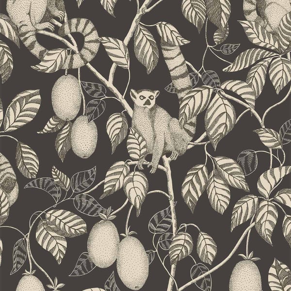 Le papier peint Elliot met en scène une végétation tropicale dense, habitée par des lémuriens aux longues queues rayées. Ces animaux aux yeux vifs se tiennent sur des branches où pendent des fruits ovoïdes. Le motif végétal oppose la rigueur du dessin à la souplesse des formes naturelles. Créé par Sandberg, ce décor révèle un paysage luxuriant dans une composition structurée.