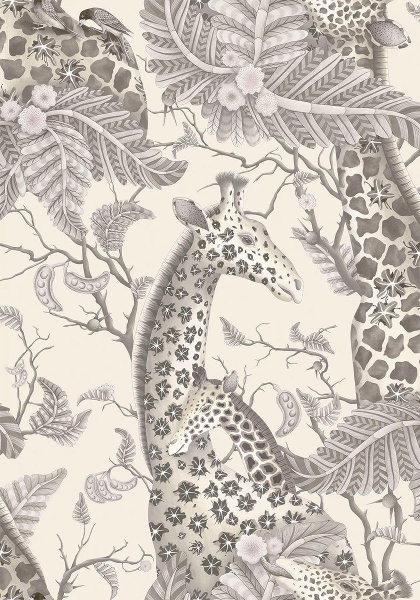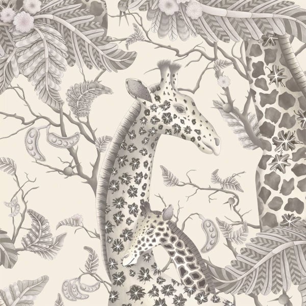 Royal Giraffe, un papier peint de Cole and Son, déploie un motif végétal et animalier d’une grande finesse. Une girafe et son petit partagent un moment de tendresse au milieu d’acacias et de cosses délicatement ouvragées. La scène séduit par la poésie de ses détails et l’équilibre entre naturalisme et imaginaire. Ce revêtement se distingue par la densité graphique du dessin.