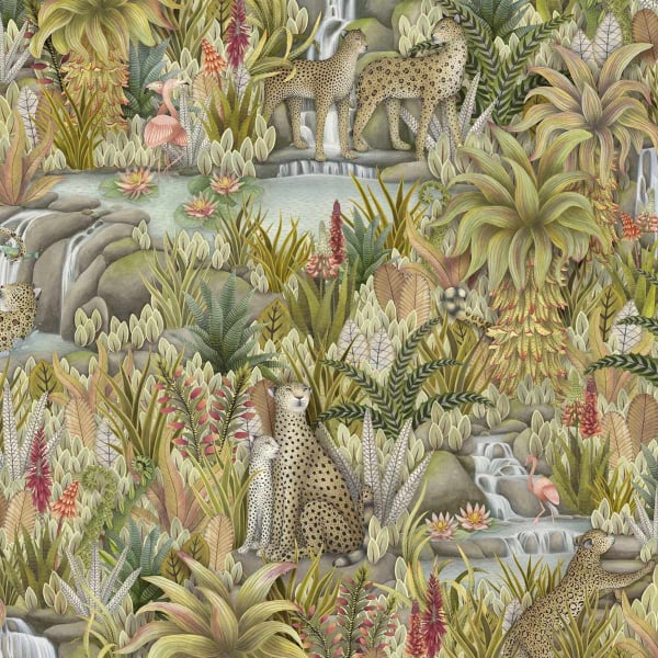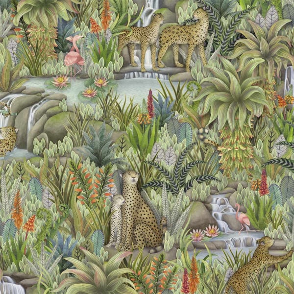 Le papier peint panoramique Injisuthi déploie une jungle luxuriante inspirée des cascades du Drakensberg. Dans ce motif tropical, les grands félins se fondent parmi les flamants, poissons et feuillages, autour de bassins scintillants. Cole and Son compose une scène immersive qui révèle de nouveaux détails à chaque regard. La profondeur visuelle repose sur une superposition minutieuse de plans, entre végétation et reflets d’eau.